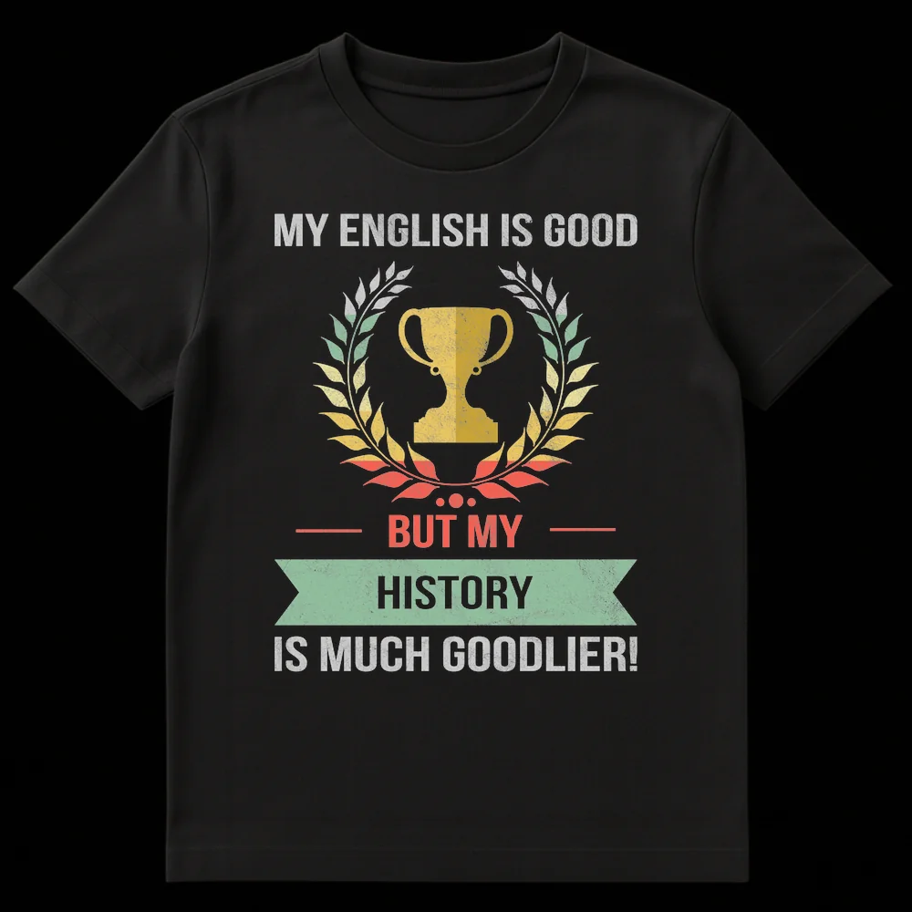 Celebrate your love for history and clever wordplay with this unique tee. Featuring the witty phrase “MY ENGLISH IS GOOD BUT MY HISTORY IS MUCH GOODLIER!” with a retro trophy graphic, it’s a self-aware nod to both language and academic passion. This shirt is perfect for history teachers, students, or anyone who appreciates intellectual humor and linguistic quirks.