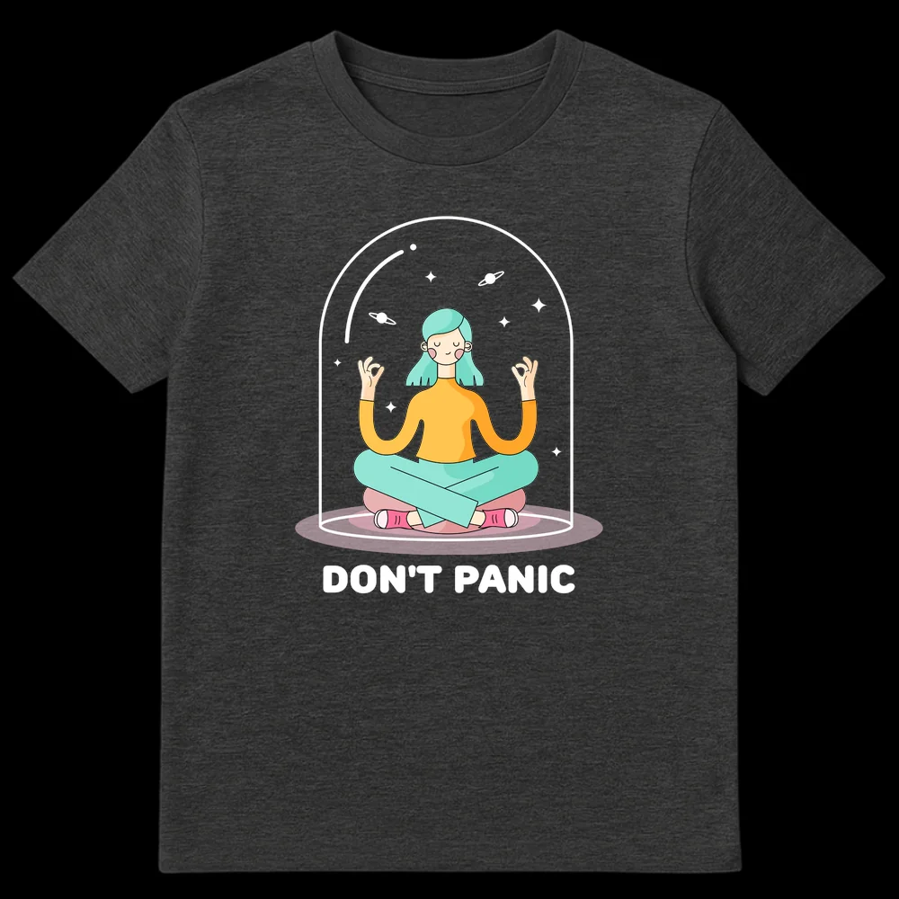 Embrace tranquility with our “DON’T PANIC” t-shirt, featuring a serene meditating figure inside a cosmic dome. This design cleverly blends the iconic Hitchhiker’s Guide to the Galaxy mantra with a powerful message of mindfulness. It’s the perfect gift for sci-fi fans, meditation practitioners, or anyone needing a calm reminder in a chaotic universe.