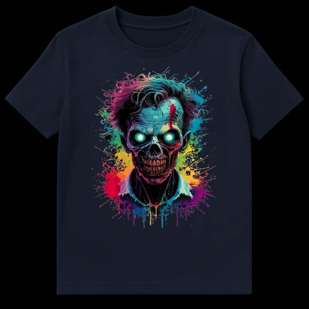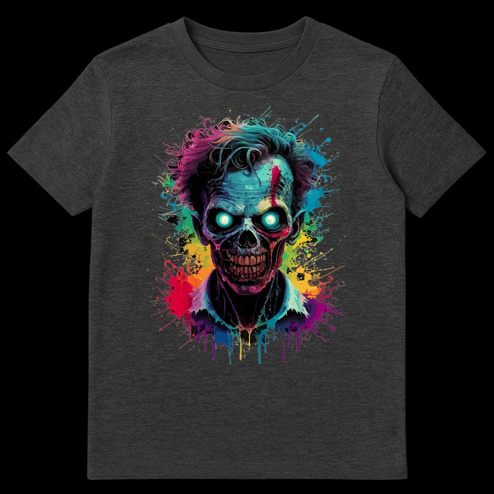 Unleash your edgy style with our eye-catching zombie t-shirt, featuring a grotesque undead portrait brought to life with an explosion of vibrant, multi-colored paint splatters. This unique design merges macabre horror with modern pop art aesthetics, making it a true statement piece. Perfect for those who appreciate unconventional art and want to stand out, it makes an ideal gift for horror fans and alternative fashion enthusiasts.