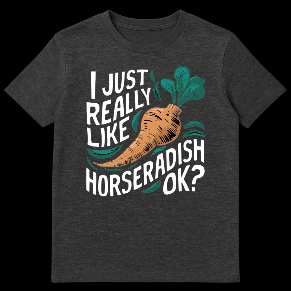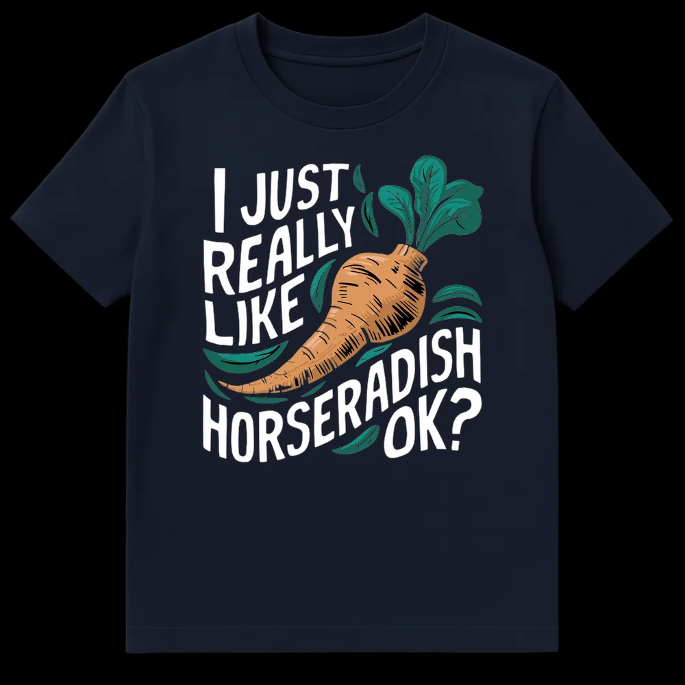 Declare your bold culinary preferences with this unique horseradish t-shirt. Featuring a stylized horseradish root and the direct, humorous phrase “I JUST REALLY LIKE HORSERADISH OK?”, it’s perfect for anyone with a strong, unapologetic love for spicy flavors. A great gift for foodies, chefs, or anyone with a quirky sense of humor.