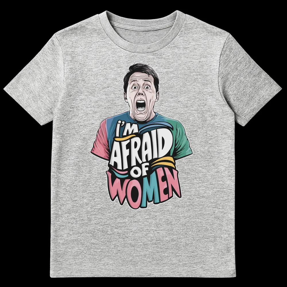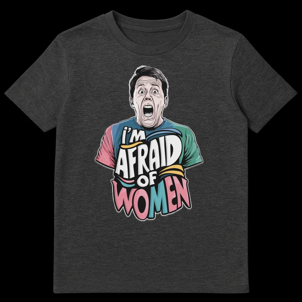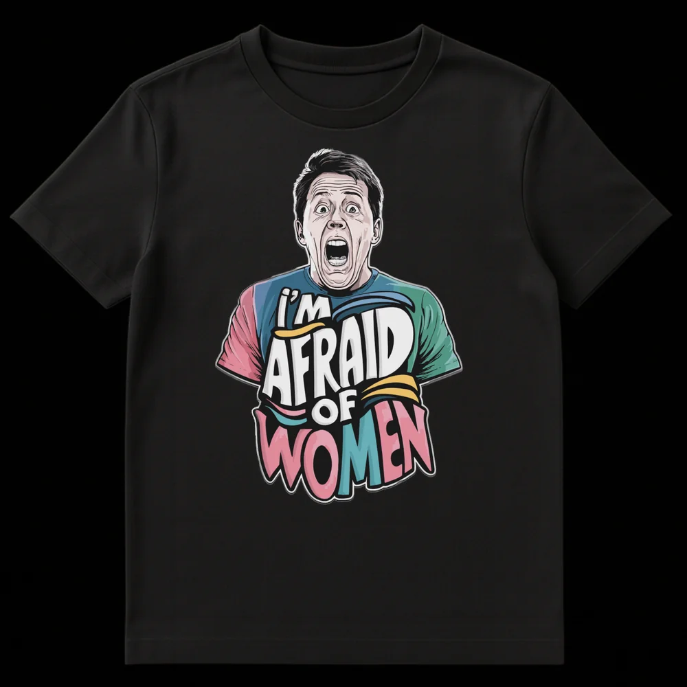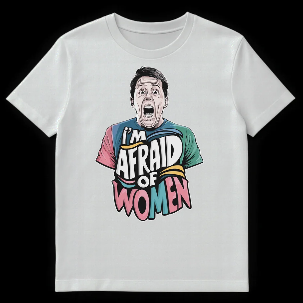 Embrace self-deprecating humor with this comic-book style t-shirt featuring a terrified man and the bold statement “I’M AFRAID OF WOMEN.” This graphic tee is perfect for those who appreciate ironic social commentary and aren’t afraid to spark a conversation. It’s a fantastic gag gift for friends who love witty, edgy humor and a unique way to express a playful personality.