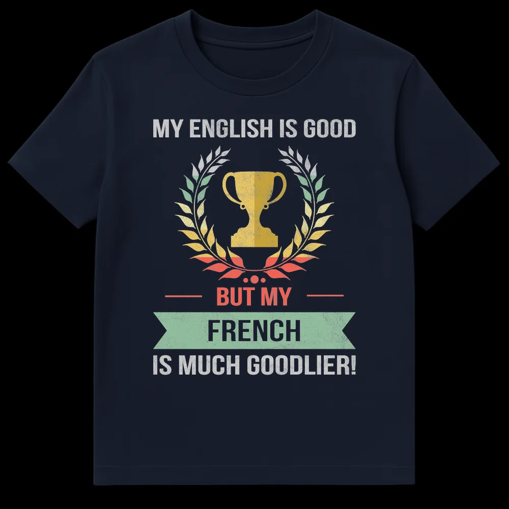 Show off your playful side with this vintage-style t-shirt featuring the witty phrase “MY ENGLISH IS GOOD BUT MY FRENCH IS MUCH GOODLIER!”. This design cleverly uses a double entendre to imply a talent for French kissing, framed by a classic trophy and laurel wreath for a touch of ironic triumph. It’s a fantastic conversation starter for those who appreciate suggestive humor and wordplay, making it an ideal gift for a partner or anyone with a cheeky personality.
