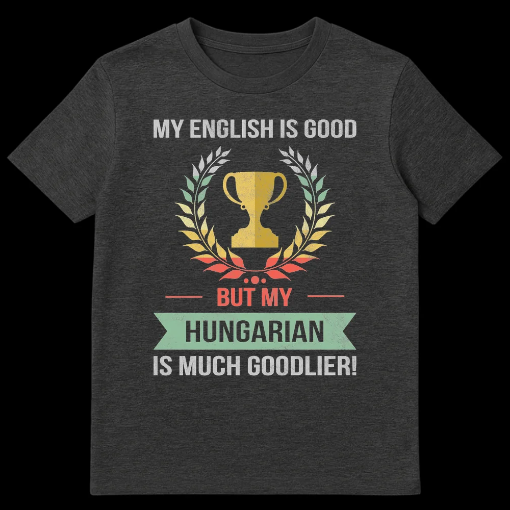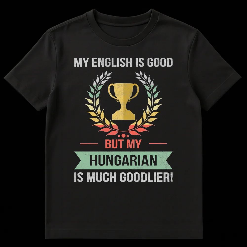 Show off your unique sense of humor and Hungarian pride with this fantastic t-shirt! The design captures a vintage, distressed aesthetic, featuring a triumphant trophy encircled by a laurel wreath—a symbol of ultimate linguistic victory. The clever text, “MY ENGLISH IS GOOD BUT MY HUNGARIAN IS MUCH GOODLIER!” will surely bring smiles and spark conversations. This shirt is not just apparel; it’s a playful statement of cultural identity, ideal for those who cherish their Hungarian heritage, expats, language learners, or anyone who enjoys smart, self-deprecating humor. It’s the ultimate gift for a proud Hungarian friend, family member, or even yourself, celebrating the joy of being exceptionally good at your native language.