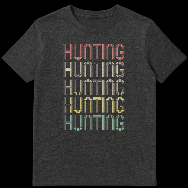 Embrace the outdoor spirit with our Vintage Hunting T-Shirt, featuring ‘HUNTING’ repeated five times in a classic 70s-80s multi-line font. Its distressed, earthy color palette on a black background creates a rugged yet stylish retro aesthetic. This unique design is a cool, understated declaration for those passionate about the hunt or simply love the vintage outdoor lifestyle. It’s the perfect gift for outdoor enthusiasts and anyone who appreciates nostalgic, text-based apparel.