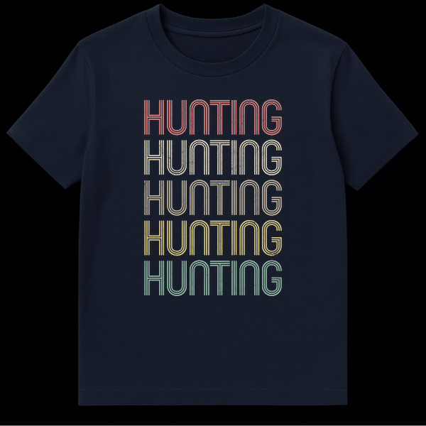 Unleash your inner adventurer with our exclusive Vintage Hunting T-Shirt, a tribute to classic outdoor aesthetics. This design showcases the word ‘HUNTING’ repeated five times in a vertically stacked arrangement, rendered in a distinctive multi-line, sans-serif font that immediately transports you back to the retro cool of the 70s and 80s. Each letter features a subtle distressed texture, enhancing its authentic, worn-in appeal, as if it’s a cherished find from a bygone era. The muted, earthy color palette—including faded coral, beige, khaki green, mustard yellow, and cool teal—pops beautifully against the solid black background, capturing a rugged, yet stylish vibe. This tee is more than just clothing; it’s a statement for the person constantly ‘on the hunt,’ whether for adventure, style, or a deep connection to the wilderness. It’s an ideal choice for outdoor enthusiasts, hunters, campers, and anyone who appreciates a design that blends nostalgic charm with a clear passion for the outdoors. Gift this unique shirt to men and women who love casual wear with a vintage, slightly rugged edge and a story to tell.
