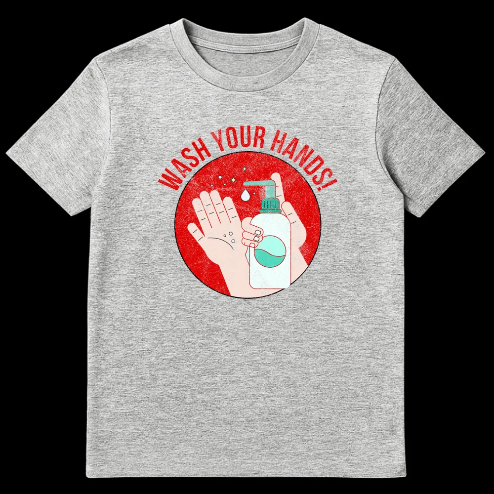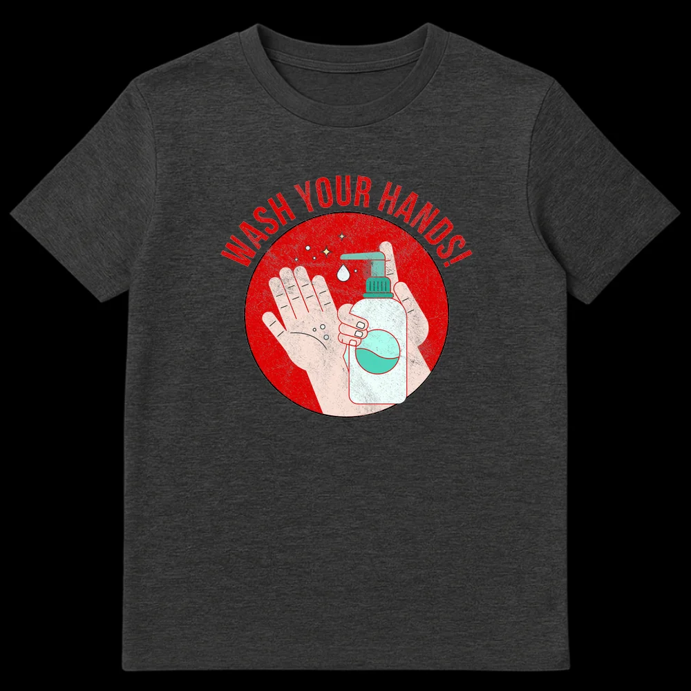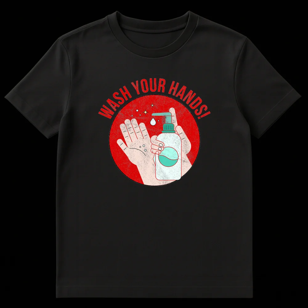 Embrace the message of good health with our “WASH YOUR HANDS!” t-shirt. This design features a compelling graphic of hands receiving soap, encircled by a bold, grunge-textured red badge, making a direct and urgent statement about hygiene. It’s a perfect gift for health-conscious individuals, essential workers, or anyone advocating for community well-being.