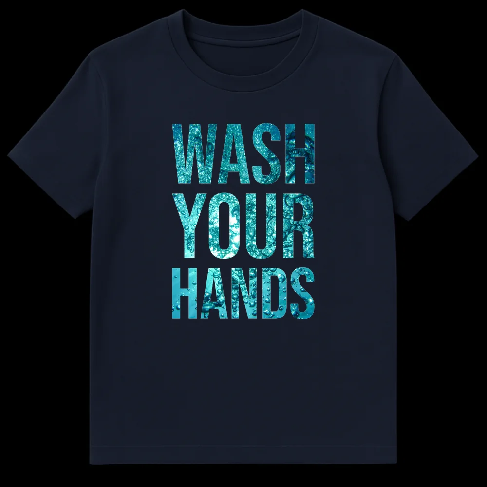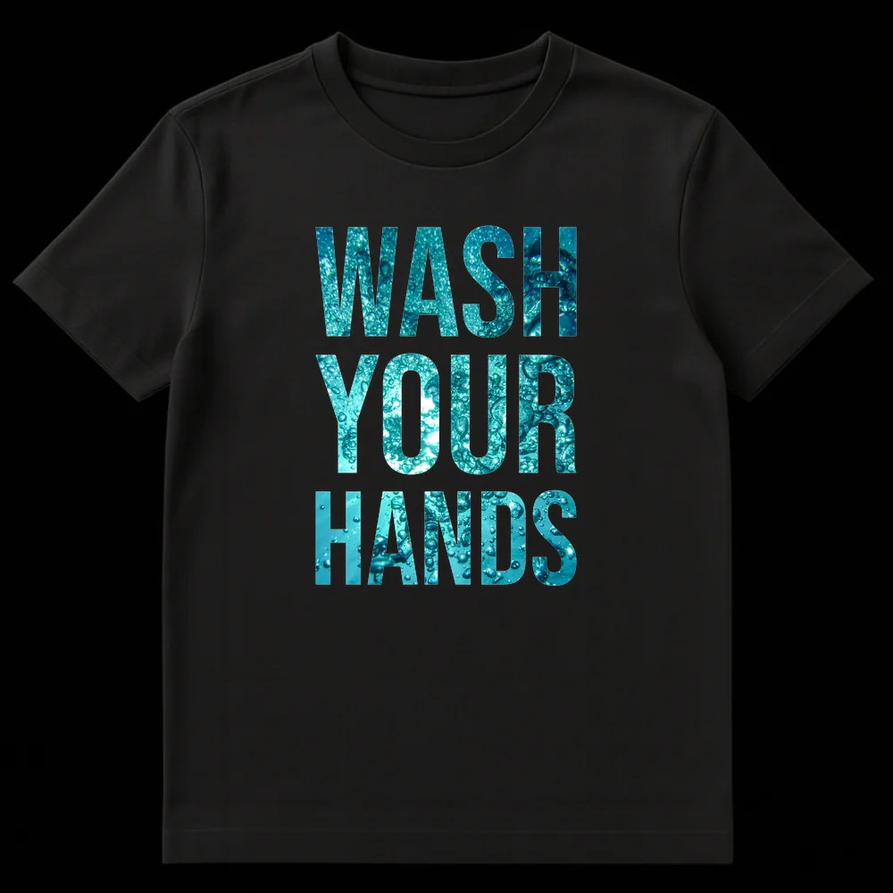 Champion health and safety with our striking “WASH YOUR HANDS” t-shirt. This design transforms a vital public health message into a modern, wearable statement. The bold, sans-serif text is infused with a high-resolution, macro photograph of dynamic water bubbles, symbolizing the very act of washing and cleanliness. Against a stark black background, the vibrant teal, cyan, and aqua tones of the water create a crisp, refreshing aesthetic. It’s an ideal choice for health-conscious individuals, medical professionals, educators, or anyone dedicated to promoting good hygiene. This tee is a functional reminder and a tasteful nod to personal responsibility, making it a thoughtful gift for essential workers, public health advocates, or family members. Spread awareness and stay safe with this impactful, clean-designed tee.