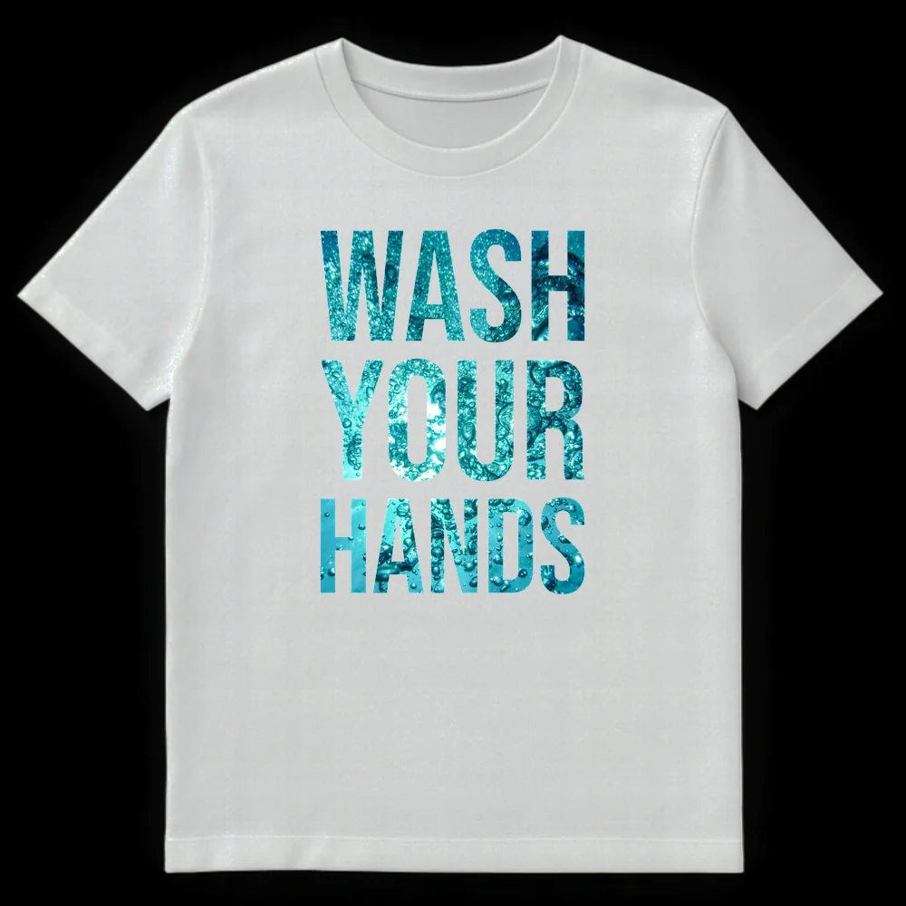 Promote essential health practices with our “WASH YOUR HANDS” t-shirt. The bold, clean typography is uniquely filled with effervescent water bubbles, creating a refreshing visual reminder of cleanliness. This design isn’t just a statement; it’s a call to action, perfect for health-conscious individuals, essential workers, or anyone who champions good hygiene. It makes an impactful gift for public health advocates or healthcare professionals.