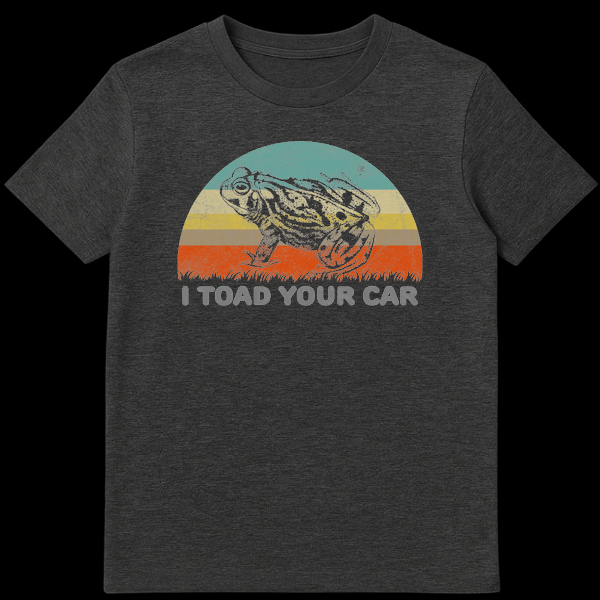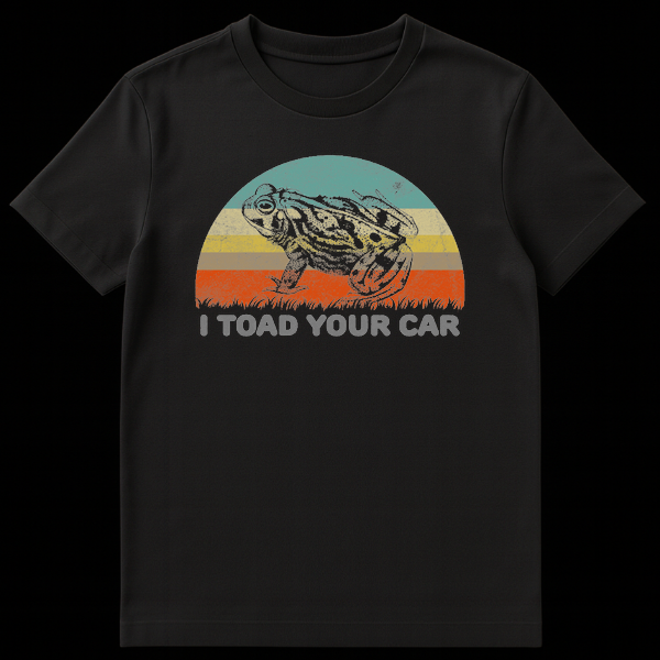 Embrace the ultimate dad joke with our ‘I Toad Your Car’ T-Shirt, a perfect blend of vintage aesthetics and rib-tickling humor. This design centers around a stoic, unbothered toad sitting proudly in front of a vibrant, 80s-style retro sunset, delivering the punchline everyone loves to hate. The joke is a clever play on words—swapping ‘towed’ for ‘toad’—making it an instant conversation starter at parties, car meets, or casual hangouts. Whether you are a fan of frogs, a roadside assistance worker with a sense of irony, or just someone who loves puns, this shirt is designed for you. It makes a fantastic birthday or Father’s Day gift for the pun-master in your life who believes no joke is too cheesy.