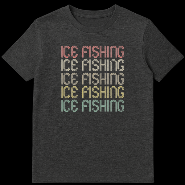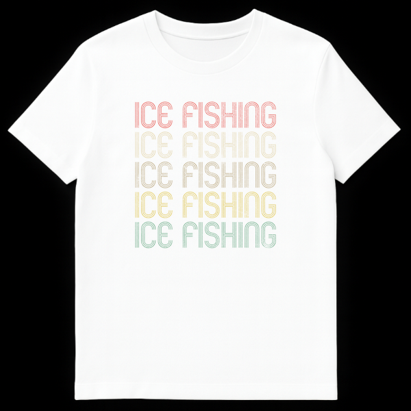 Dive into the cool aesthetic of ice fishing with our unique retro-inspired t-shirt. This design proudly showcases “ICE FISHING” repeated five times in a distinctive striped font, evoking the golden era of 70s and 80s athletic wear. Each line of text transitions through a captivating, distressed earthy gradient, adding a touch of vintage charm and a lived-in feel to a solid black background. It’s a subtle yet powerful declaration of your love for the sport, free of overt humor, focusing purely on a stylish tribute to the dedication of an ice angler. Perfect for avid fishermen and fisherwomen, winter sports enthusiasts, or anyone drawn to classic outdoor themes with a nostalgic flair. Whether you’re drilling holes on the ice or simply enjoying a casual day out, this comfortable tee expresses your identity with cool, understated style. It makes an exceptional gift for a fishing dad, mom, or any ice fishing trip companion.