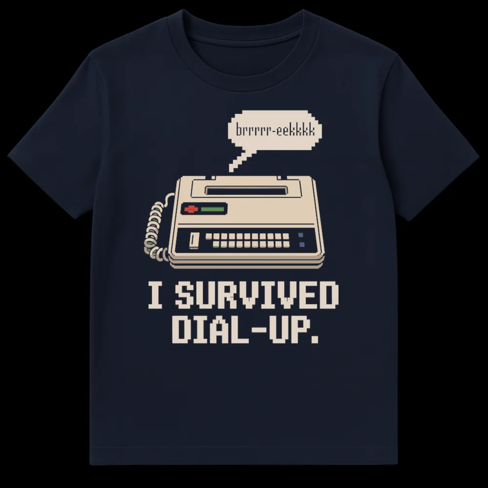 Step back to a time of screeching modems and slow connections with our “I SURVIVED DIAL-UP.” pixel art t-shirt. This design perfectly captures the iconic 8-bit aesthetic of early digital graphics, featuring a classic dial-up modem emitting its infamous “brrrrr-eekkkk” connection sound. It’s a hilarious and relatable nod to a bygone era of internet access, celebrating the patience and resilience of those who navigated the web before broadband. A fantastic conversation starter and a badge of honor for anyone who remembers the pain (and charm) of 56k, this tee is an ideal gift for internet pioneers, retro tech lovers, and anyone who appreciates a good dose of 90s nostalgia.