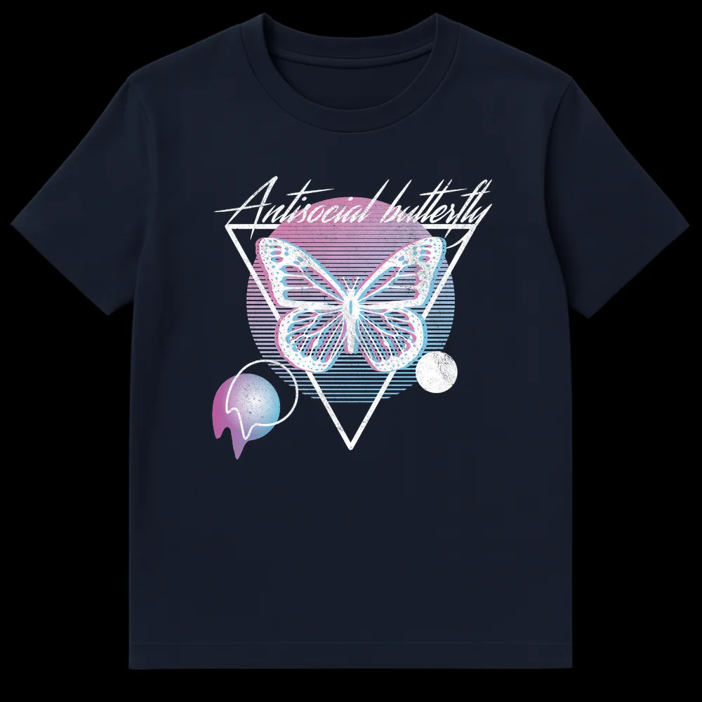 Embrace your solitude with our “Antisocial Butterfly” t-shirt, blending witty humor with a striking Vaporwave aesthetic. This design features a glitched butterfly with a vibrant pink-to-blue gradient and distressed textures, perfect for those who appreciate retro 80s/90s digital art. It’s a humorous and stylish statement for introverts, gamers, or anyone who loves ironic self-expression.