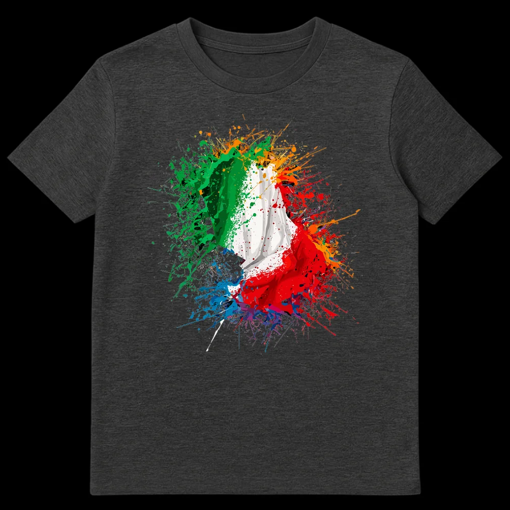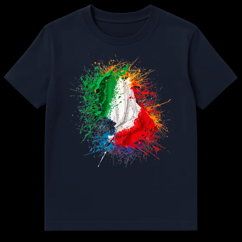 Embrace the vibrant spirit of Italy with this dynamic paint-splatter Italian flag design. This t-shirt transforms the classic Tricolore into an abstract expression of passion and artistry, featuring energetic splashes of green, white, and red with accent colors. It’s a striking way to showcase your love for Italian culture, art, or heritage, making it an ideal gift for Italophiles and proud Italians.