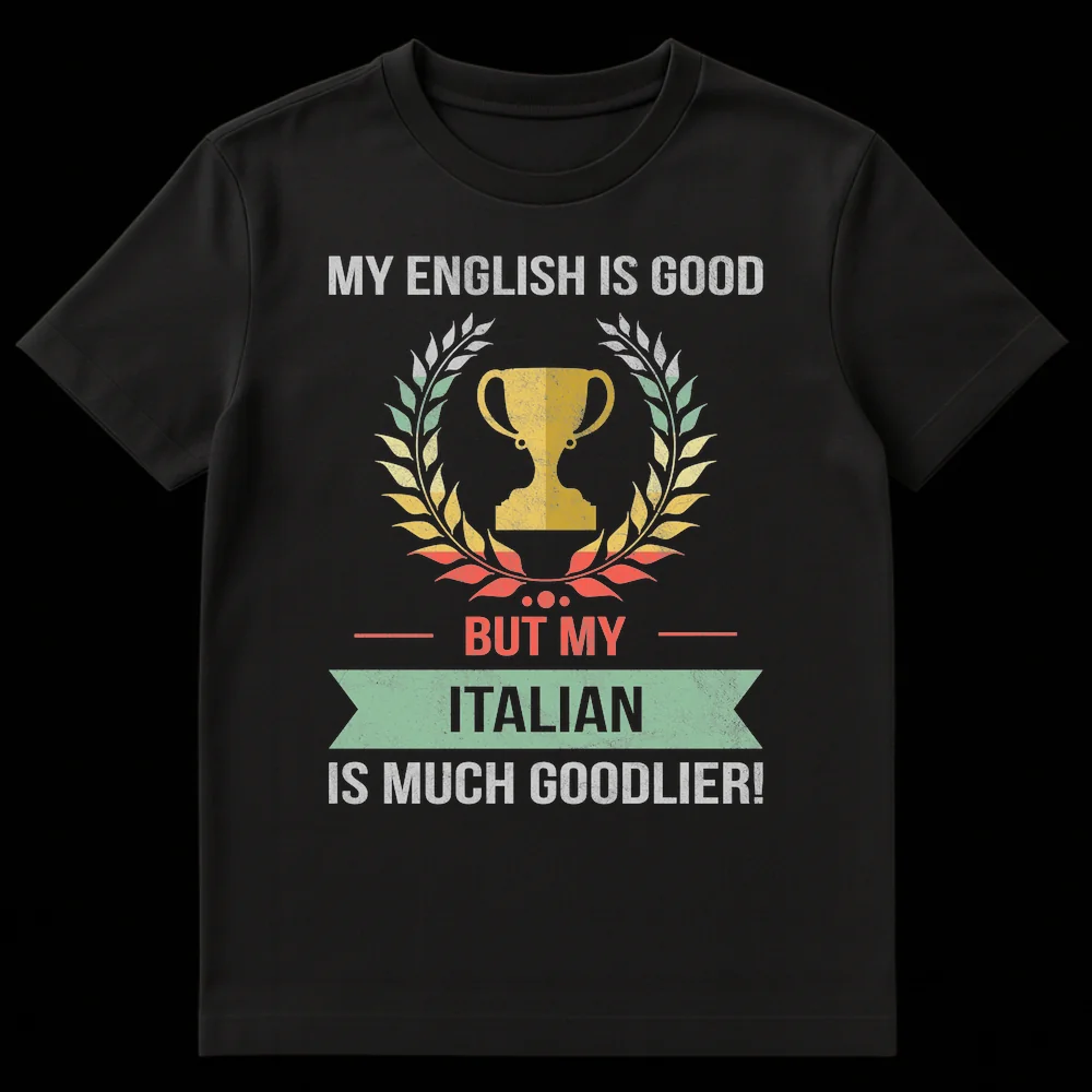 Show your Italian pride with this humorous vintage-style t-shirt featuring the playful phrase “MY ENGLISH IS GOOD BUT MY ITALIAN IS MUCH GOODLIER!”. This design cleverly uses a linguistic pun, complete with a trophy and laurel wreath, to celebrate a love for Italian culture. It’s the perfect funny Italian gift for language learners, Italophiles, or anyone proud of their Italian heritage.
