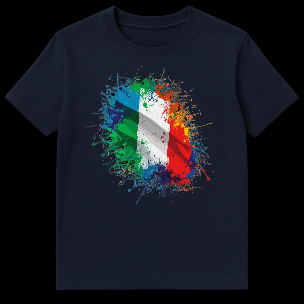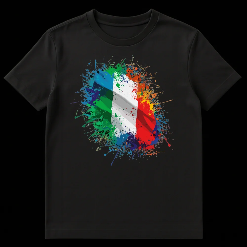 Celebrate your passion for Italy with this dynamic t-shirt featuring the Italian flag reimagined in a striking paint splash style. Its abstract expressionist aesthetic, bursting with vibrant colors against a black background, offers a unique and modern take on national pride. Perfect for anyone with Italian heritage, travel enthusiasts, or fans of contemporary artistic designs, this shirt makes a fantastic gift.