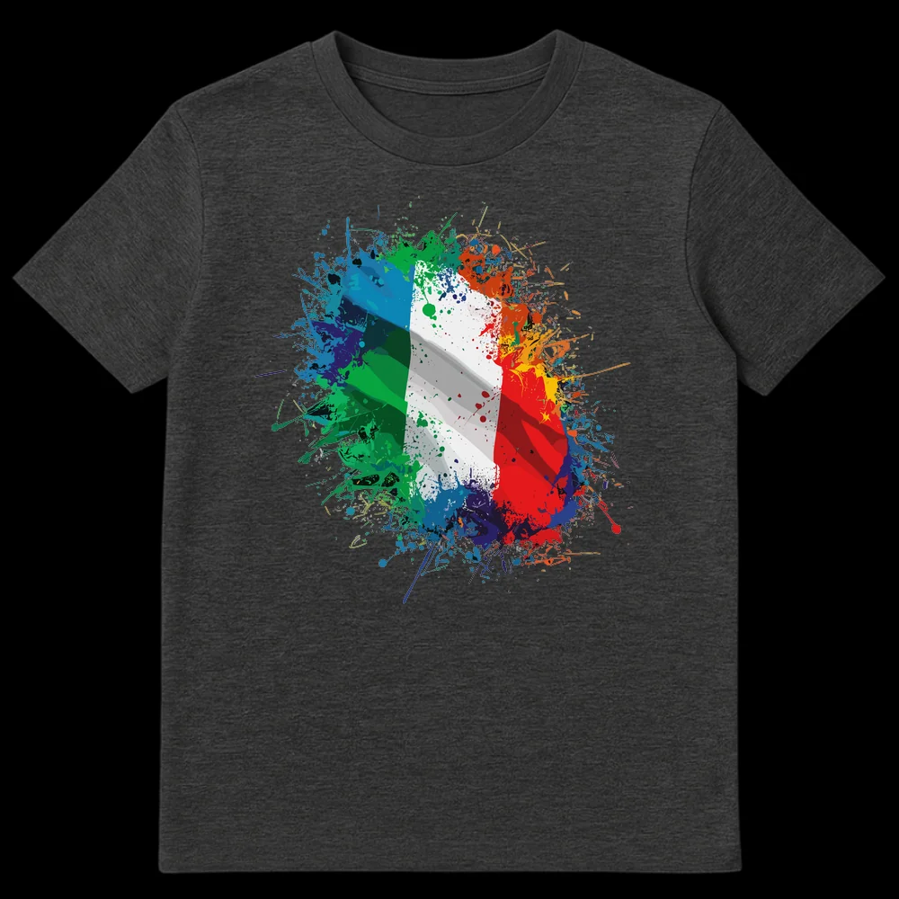 Embrace the vibrant spirit of Italy with this captivating t-shirt, showcasing the iconic Italian flag (green, white, and red) transformed into an explosion of paint splatters and energetic drips. This abstract expressionist design is a colorful homage to Italian heritage, bursting with secondary and tertiary hues that create a dynamic rainbow effect against a stark black canvas. It’s more than just a flag; it’s a modern, artistic statement of national pride and cultural appreciation. The paint splashes symbolize Italy’s passionate essence, rich artistic history, and the overflowing enthusiasm for its culture, cuisine, and people. Ideal for individuals of Italian descent, avid travelers, sports fans, or anyone who appreciates artful and stylish cultural expressions, this tee is designed to convey pride, passion, and a contemporary connection to Italy. It’s the perfect stylish gift for those who carry Italy in their hearts.
