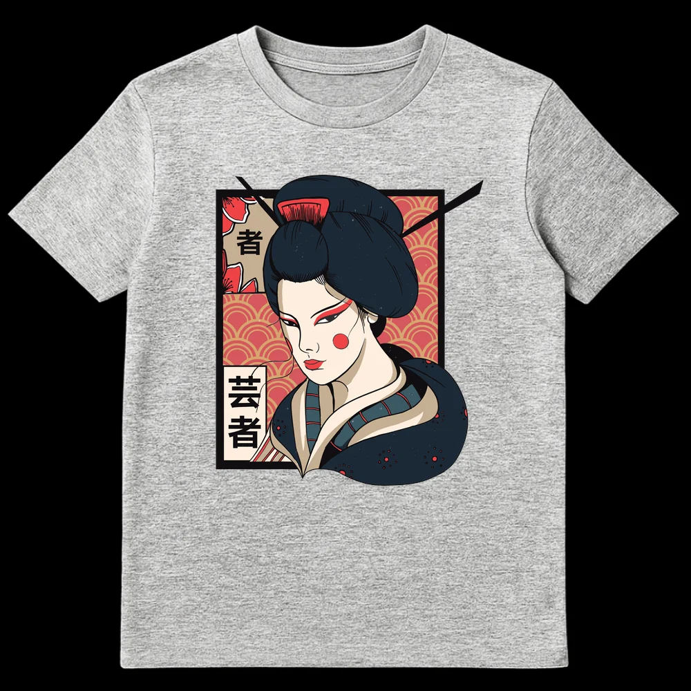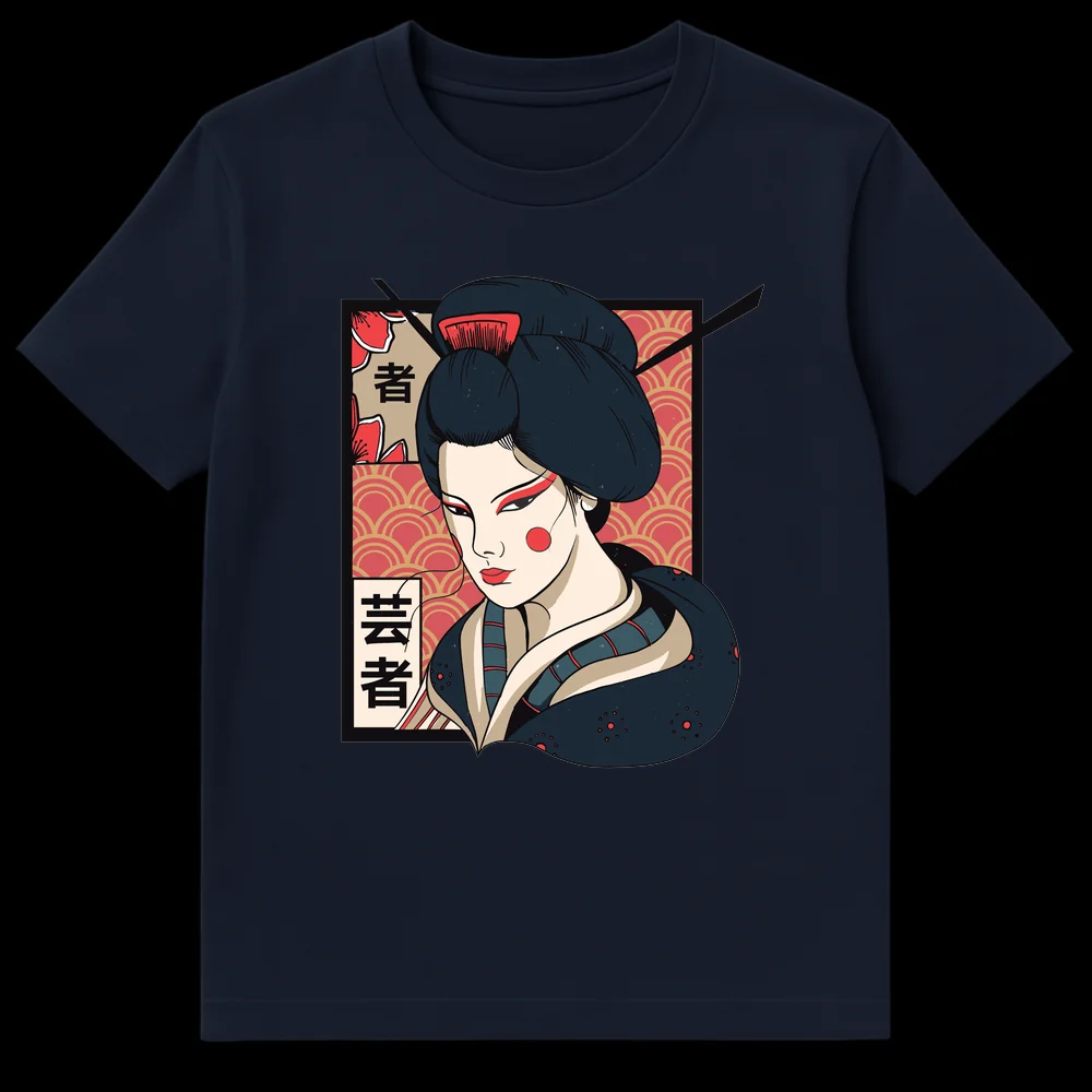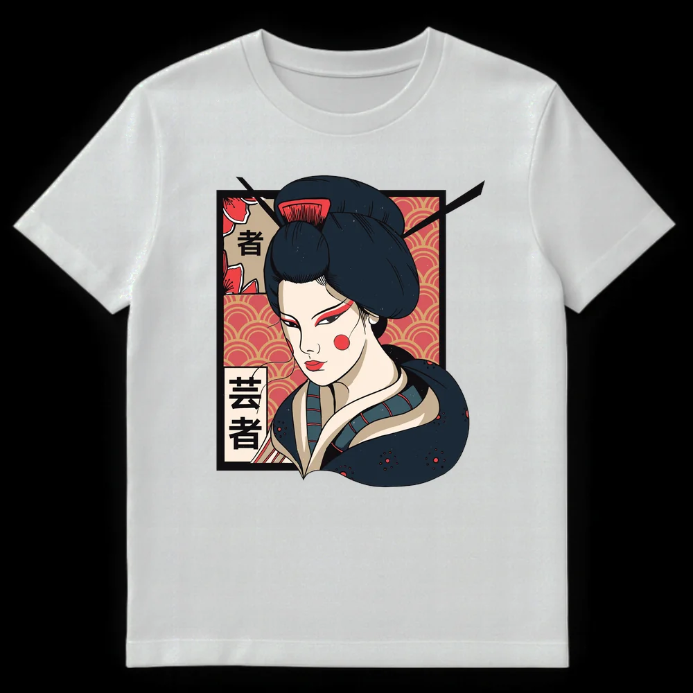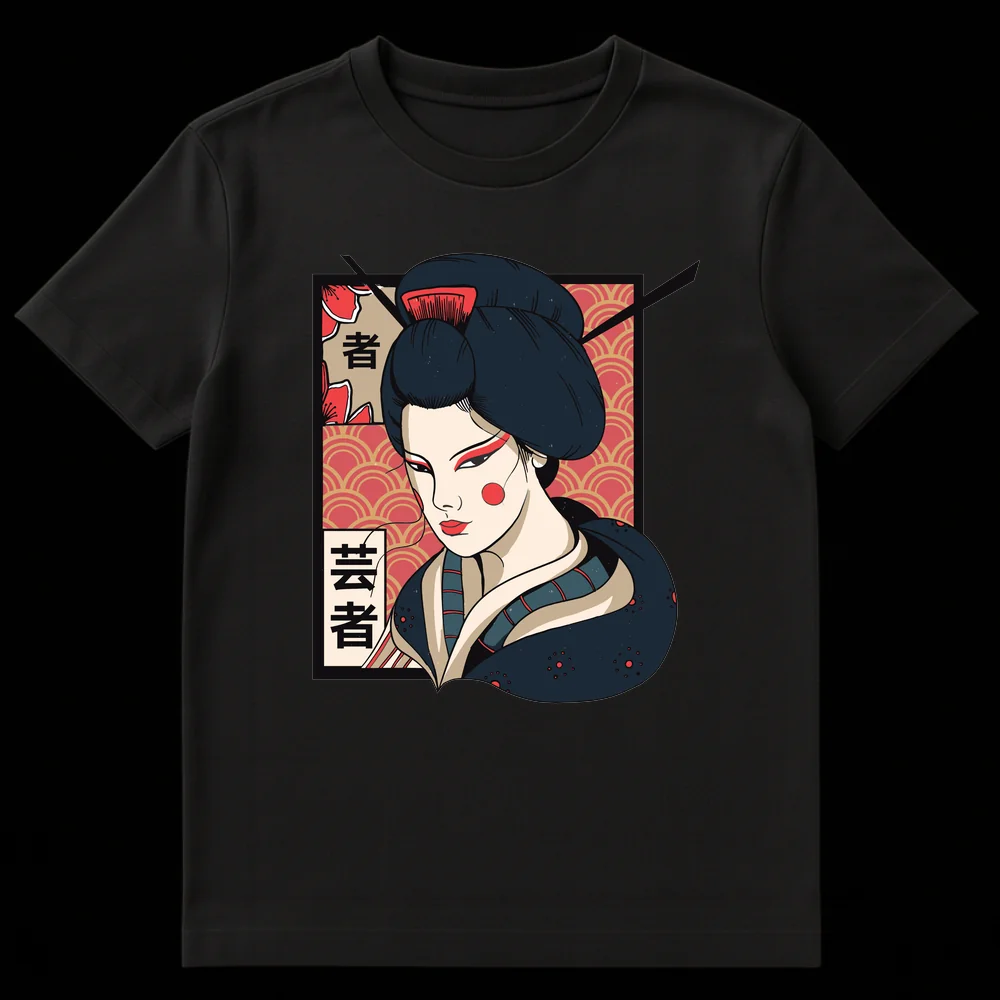 Tags: Asian art wear, Cultural icon, Elegant Geisha, Geisha portrait, Japanophile clothing, Kanji shirt, Kimono fashion, Traditional Japanese, Ukiyo-e apparel