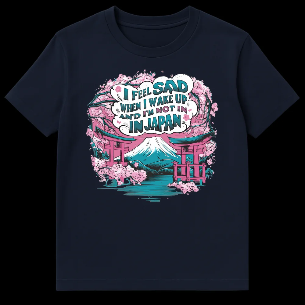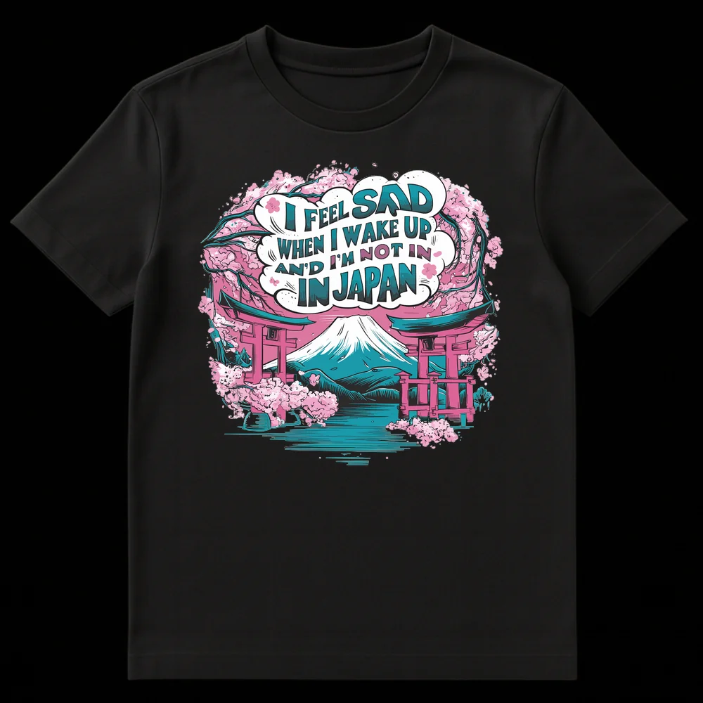 Embrace your wanderlust with this unique tee featuring a stylized Mount Fuji, cherry blossoms, and torii gates. The text “I FEEL SAD WHEN I WAKE UP AND I’M NOT IN JAPAN” humorously expresses a deep longing for the beautiful country. Perfect for Japanophiles, travel enthusiasts, or anyone dreaming of their next Japanese adventure. It’s an ideal gift for friends who share your passion for Japan.