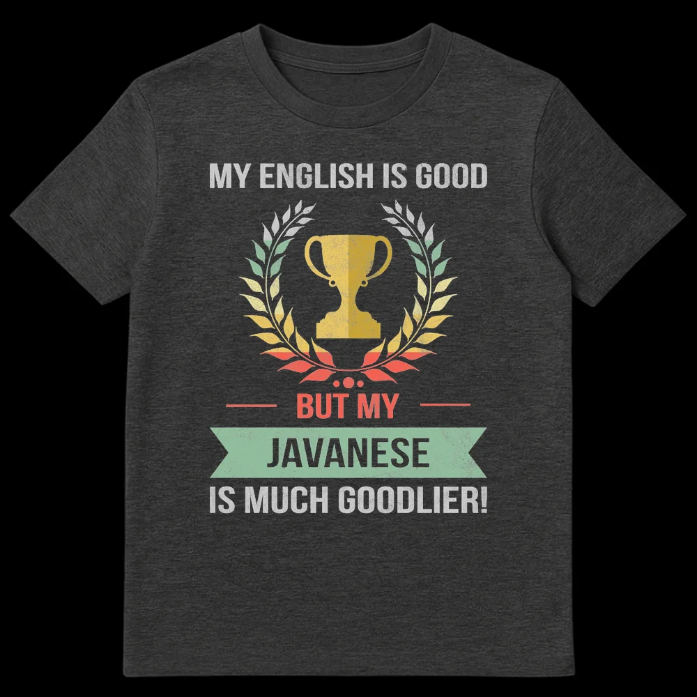 Celebrate your Javanese pride with this witty t-shirt! Featuring the humorous slogan “MY ENGLISH IS GOOD BUT MY JAVANESE IS MUCH GOODLIER!”, it’s a playful nod to linguistic identity. This retro-vintage design, complete with a trophy and laurel wreath, makes a perfect statement for anyone who cherishes their Javanese heritage or appreciates clever language jokes. Ideal as a unique gift for Javanese speakers and culture enthusiasts.