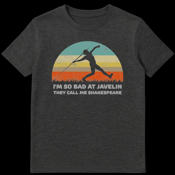 Perfect for athletes with more wit than throwing accuracy, this hilarious t-shirt playfully combines the world of track and field with literary humor. The design features the self-deprecating line, “I’m so bad at javelin They call me Shakespeare,” a witty nod to those who might be better with words than spears. It’s an ideal gift for javelin throwers, track and field athletes, or sports fans who appreciate a good laugh.