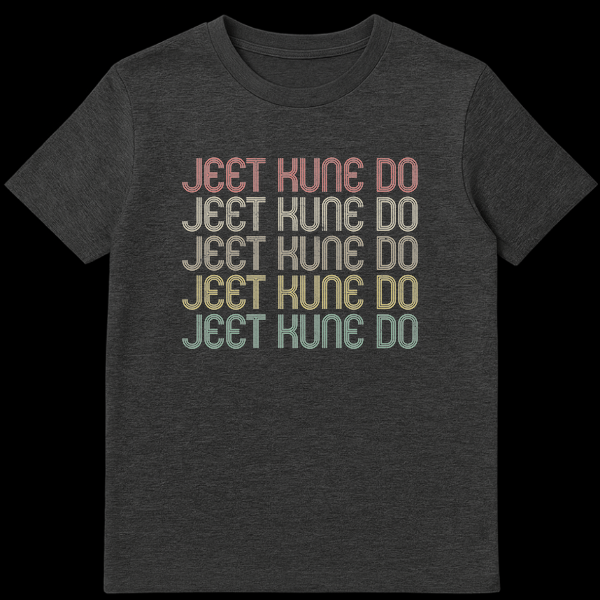 Step into the world of martial arts philosophy with our exclusive Jeet Kune Do t-shirt, a direct homage to Bruce Lee’s enduring legacy. This design isn’t just clothing; it’s a statement, featuring the powerful “JEET KUNE DO” phrase in a captivating retro-futuristic font. Each stacked line boasts a unique color from a cool rainbow gradient – salmon pink, beige, yellow-gold, chartreuse green, and pale teal – all subtly distressed for a truly authentic vintage feel. This tee is ideal for dedicated JKD practitioners, passionate Bruce Lee fans, or anyone who admires the Way of the Intercepting Fist and classic 70s/80s aesthetics. It’s more than a shirt; it’s a way to express your pride, identity, and respect for a martial arts icon, making it an excellent gift for any martial artist or vintage style enthusiast.