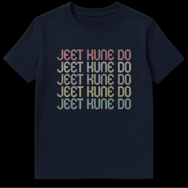 Embrace the spirit of Bruce Lee with this iconic Jeet Kune Do t-shirt, featuring the legendary martial art philosophy. The unique retro-futuristic font, repeated in a vibrant rainbow gradient with a distressed finish, captures a cool 70s/80s vibe. It’s a perfect statement piece for JKD practitioners, Bruce Lee fans, or anyone who appreciates vintage martial arts culture.