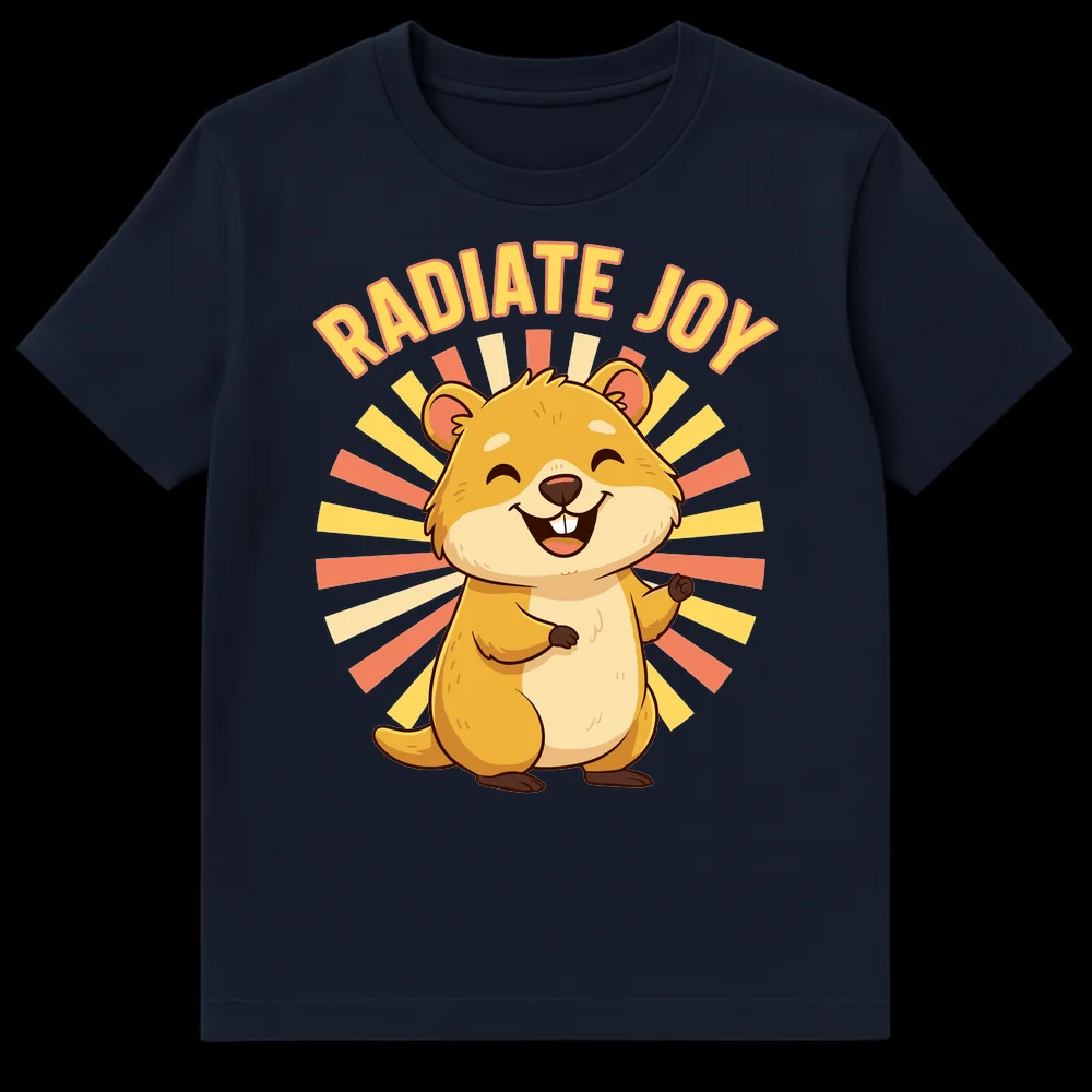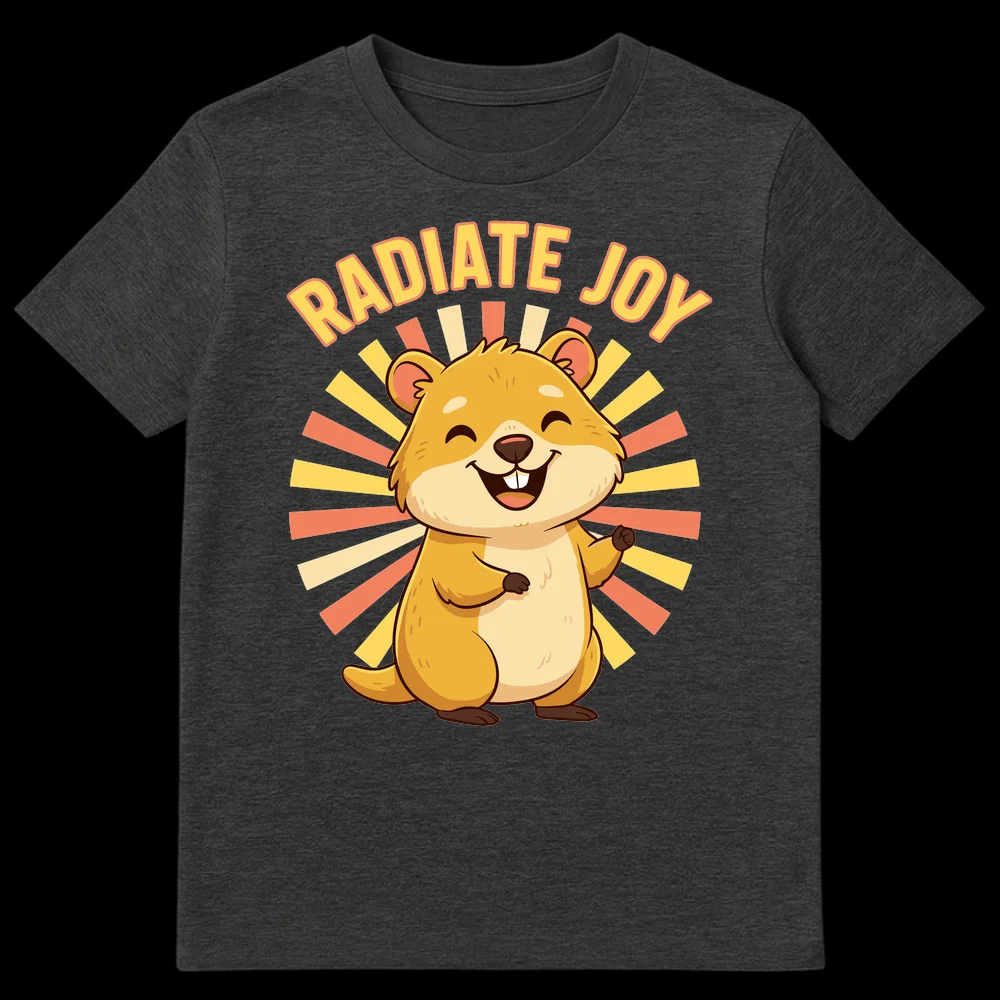 Spread happiness with this adorable ‘RADIATE JOY’ t-shirt featuring a cute, smiling groundhog and a vibrant sunburst. This design embodies pure optimism, making it a perfect pick-me-up for anyone who loves positive vibes and charming animal art. It’s an ideal gift for animal lovers, optimists, or anyone needing a daily dose of cheer.