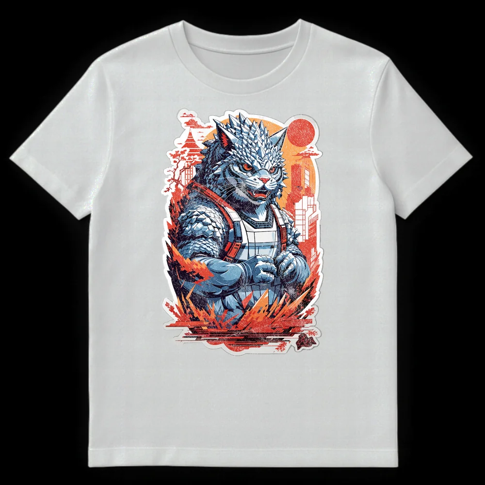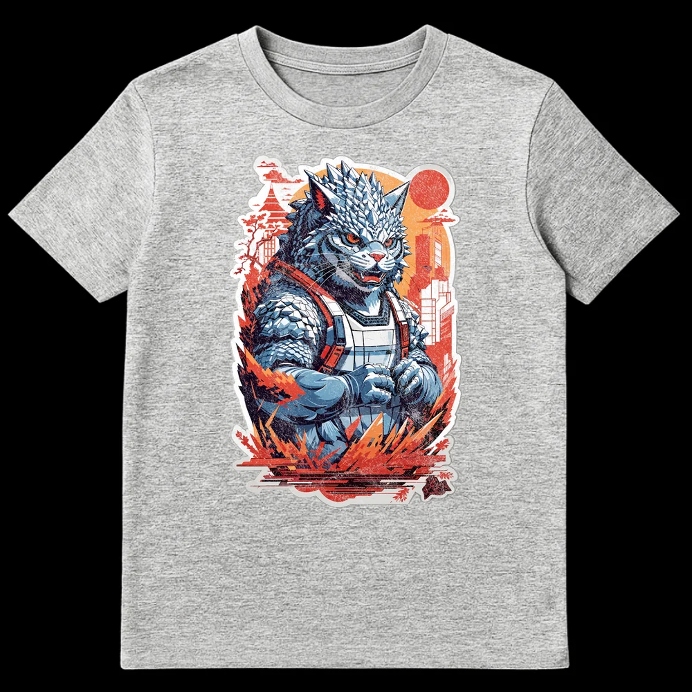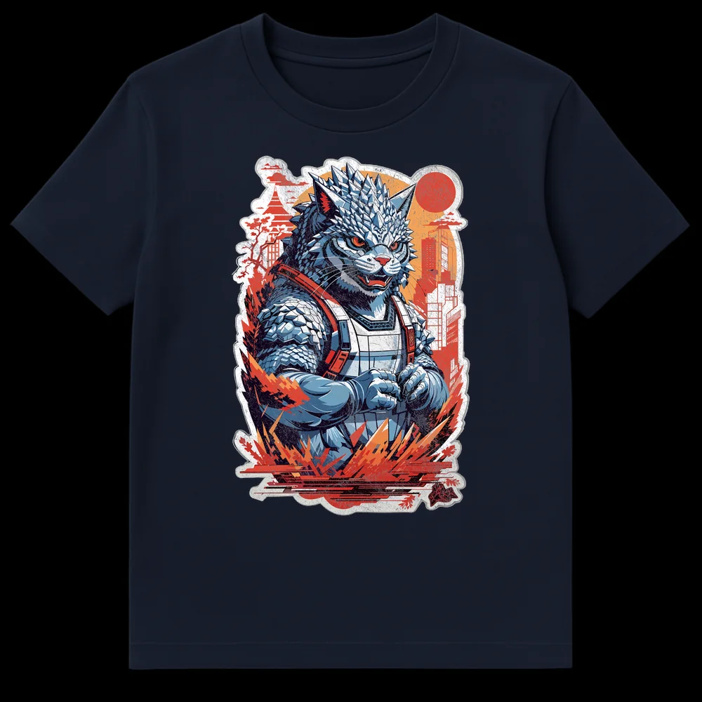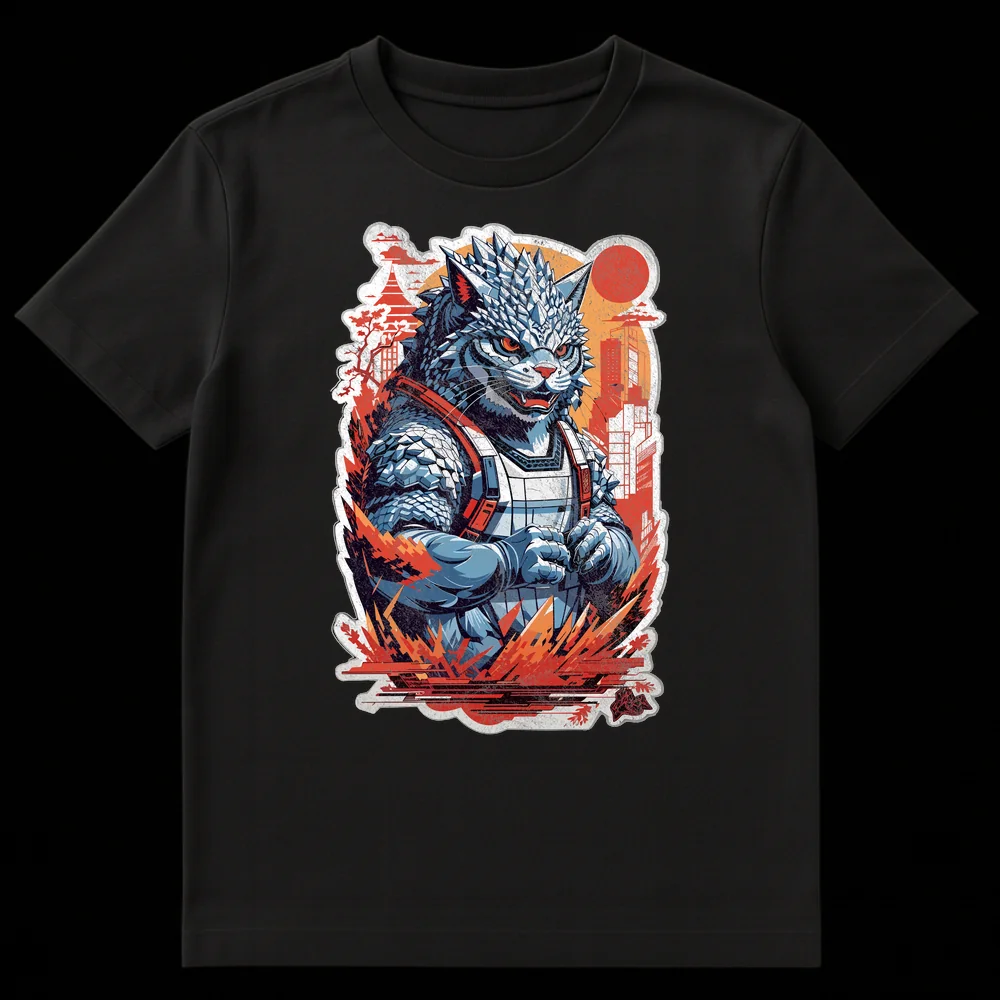 Embrace the chaos with our exclusive Kaiju Catzilla T-Shirt, where a colossal, spiky cat-like monster transforms a serene Japanese city into its personal playground. This striking design captures a fierce feline kaiju amidst burning skyscrapers and a traditional pagoda, all silhouetted against a dramatic, distressed red rising sun. It’s a brilliant visual pun on the destructive tendencies of house cats, elevated to a cinematic, city-smashing scale. Crafted for fans of Japanese pop culture, Godzilla movies, and, of course, mischievous cats, this shirt is a conversation starter. The artwork blends Kaiju/Mecha anime style with Ukiyo-e aesthetics, rendered in a bold, high-contrast palette of cool blues and warm oranges. This t-shirt is a must-have gift for kaiju enthusiasts, cat owners with a sense of humor, and anyone who loves genre-bending, statement-making apparel.