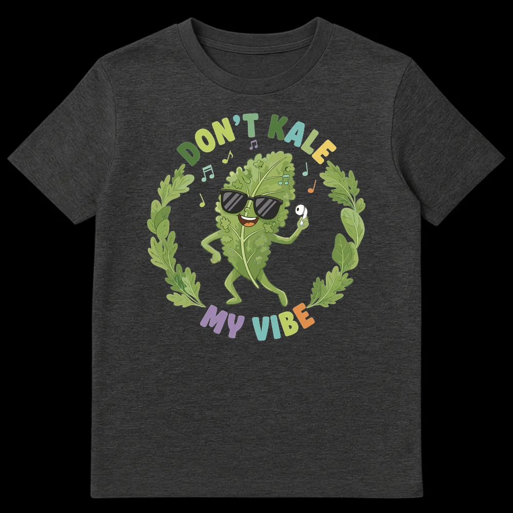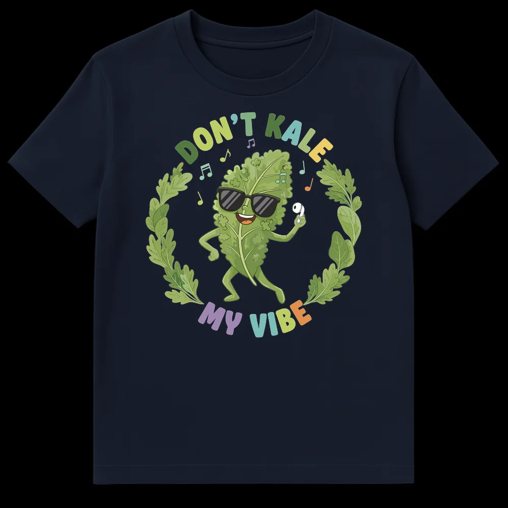 Don’t Kale My Vibe! This vibrant tee features a cool, dancing kale leaf with sunglasses and earbuds, celebrating positive energy with a clever pun. Perfect for healthy eaters, vegans, vegetarians, or anyone who loves a good laugh and good vibes. Makes a unique gift for pun lovers and music enthusiasts alike.