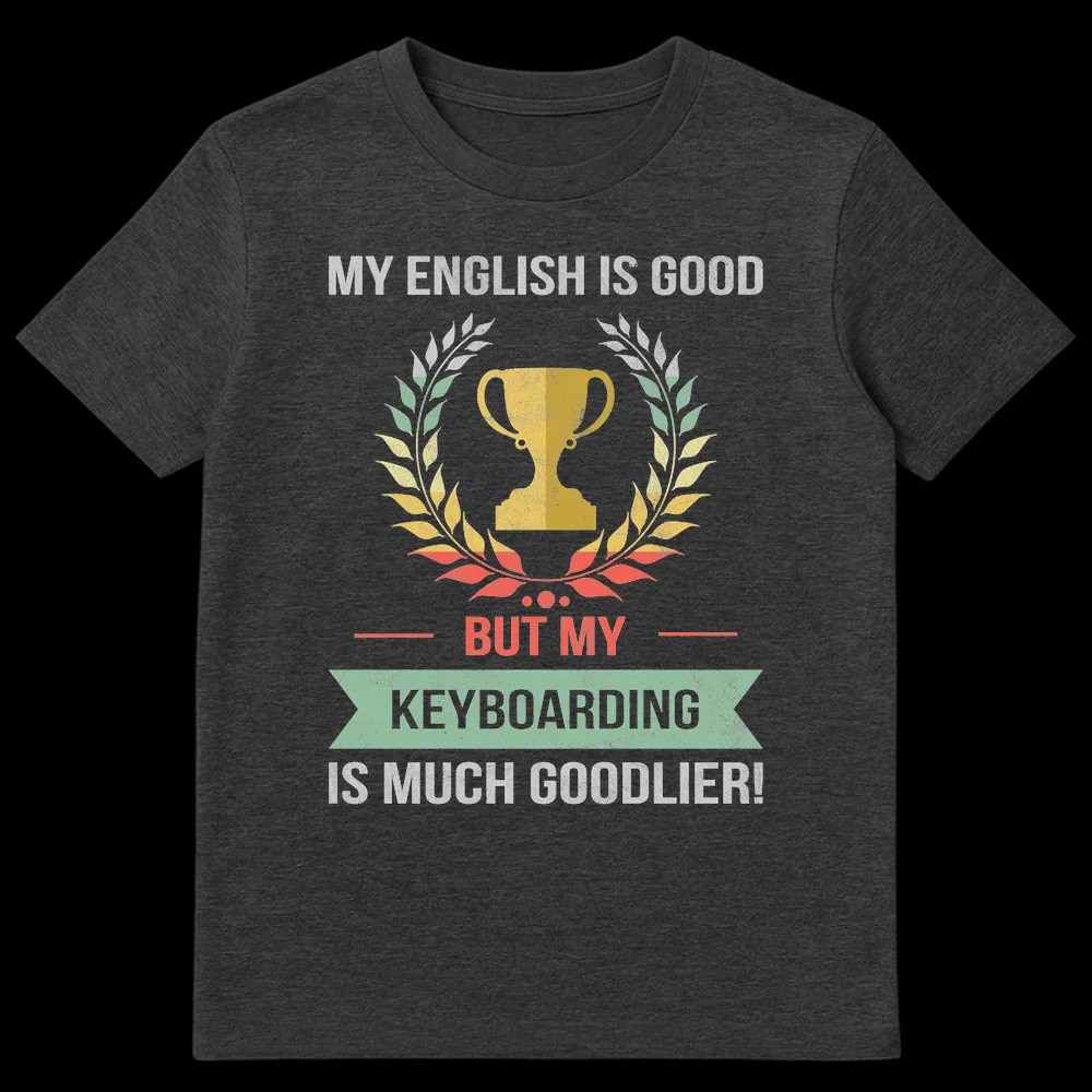 Show off your unique blend of digital dexterity and playful humor with our ‘My English Is Good, But My Keyboarding Is Much Goodlier!’ t-shirt. This design, featuring a distressed retro-typography style with a champion’s trophy motif, celebrates the unsung heroes of the keyboard. It’s a clever, self-deprecating jab at grammar rules, humorously prioritizing the practical skill of typing over linguistic perfection using the intentionally incorrect ‘goodlier.’ Perfect for programmers, hardcore gamers, dedicated writers, transcriptionists, or any tech enthusiast who spends more time perfecting their WPM than their sentence structure. This shirt makes a relatable statement, sparking smiles and nods of recognition from fellow digital natives. A truly unique and funny gift for the computer geek or keyboard warrior in your life.