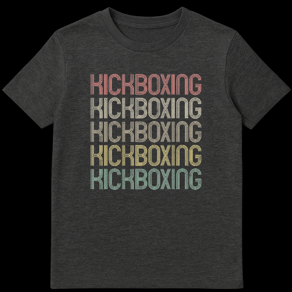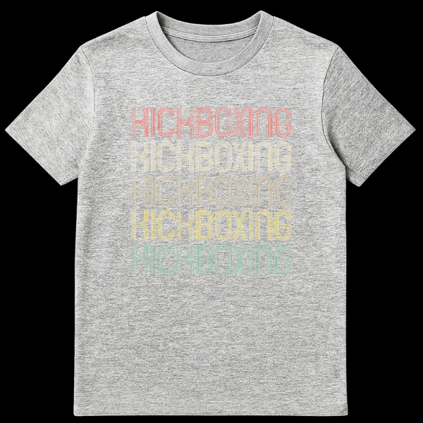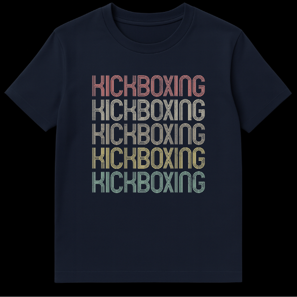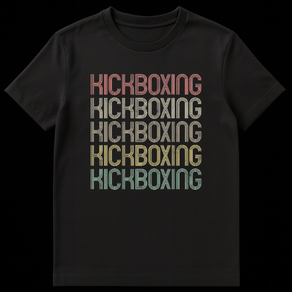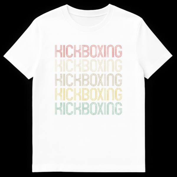 Step into style with our KICKBOXING t-shirt, a direct and impactful statement for any martial arts enthusiast. This design showcases the word “KICKBOXING” repeated five times, creating a powerful, repetitive pattern. The retro/vintage typography features a unique striped effect within each character, enhanced by a distressed, grunge texture that gives it a perfectly worn, authentic feel. The muted gradient color palette, transitioning from a faded coral to mustard yellow and subtle teal, offers a classic athletic aesthetic that stands out against the black background. It’s more than just a shirt; it’s a testament to your commitment to the sport, blending old-school charm with your love for combat fitness. Ideal for practitioners, fans, and anyone who appreciates a design that speaks to their passion with an understated yet powerful visual. Gift this unique tee to celebrate their dedication!