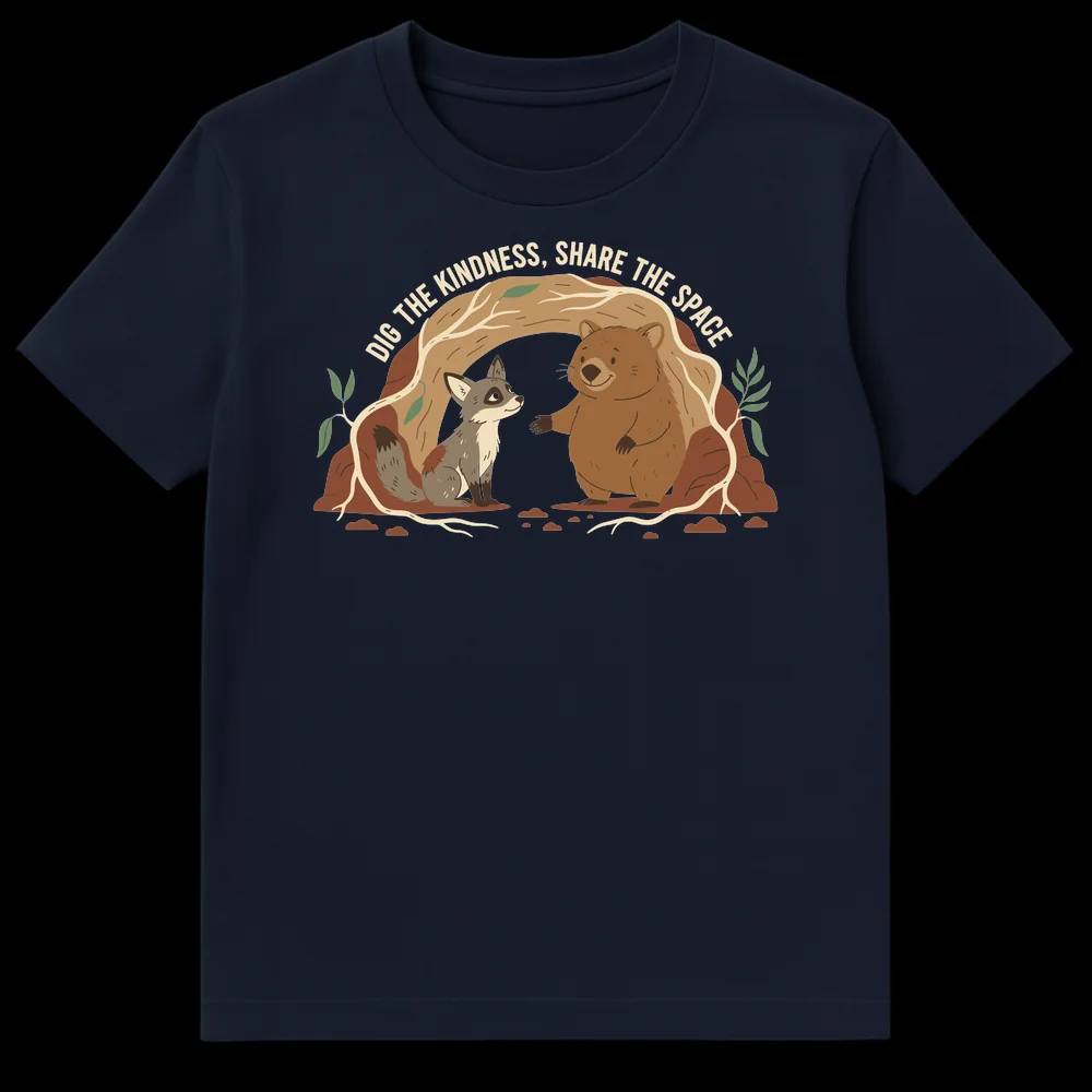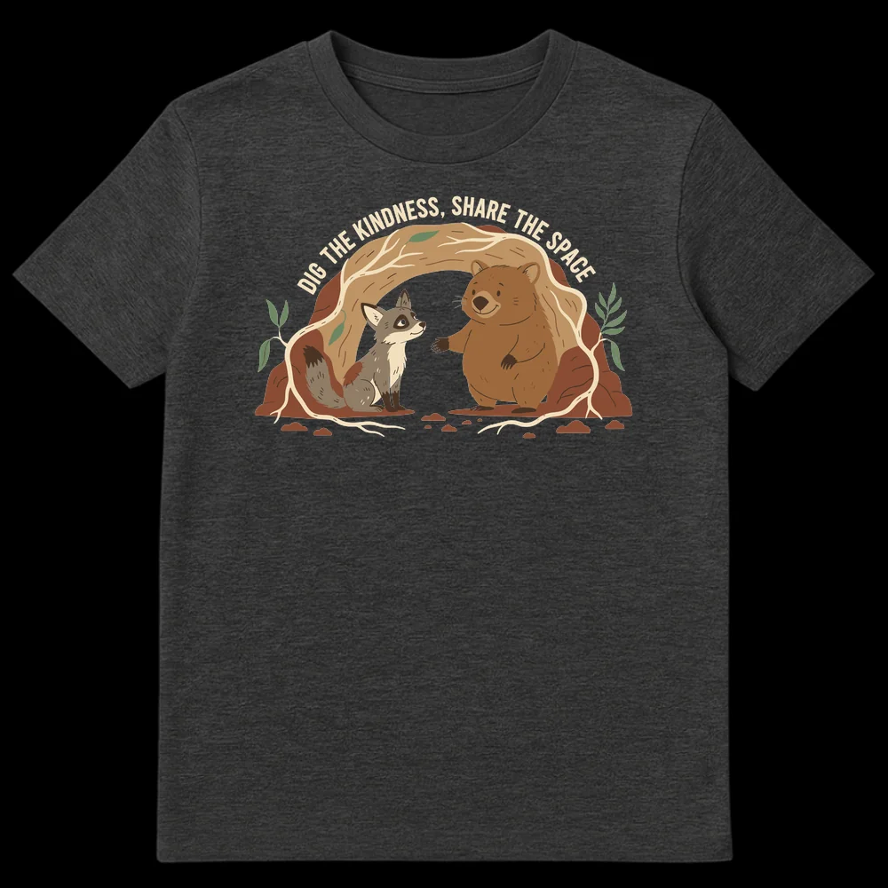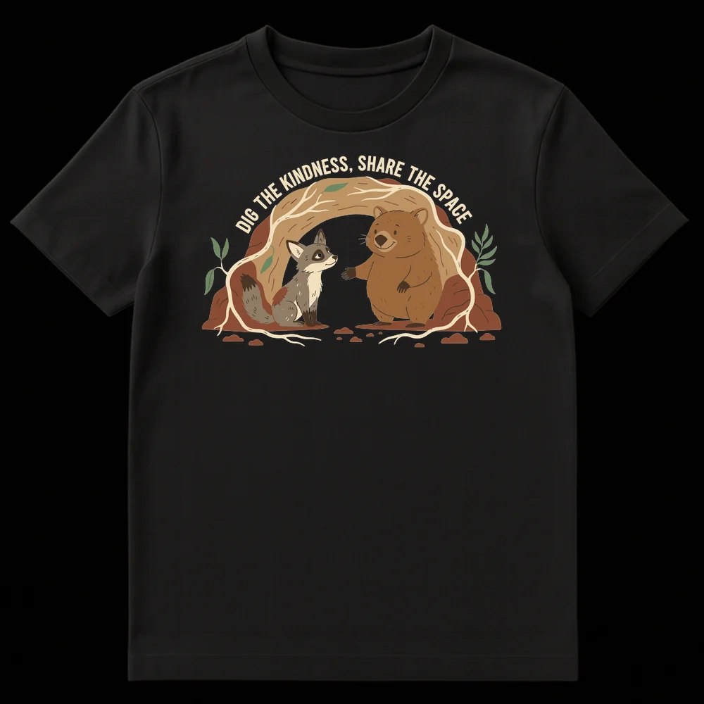 Embrace a message of empathy with this charming t-shirt featuring a friendly wombat and raccoon sharing a burrow. The clever phrase “DIG THE KINDNESS, SHARE THE SPACE” uses animal behavior as a pun to advocate for kindness and coexistence. It’s a heartwarming design perfect for nature lovers and anyone who champions a more inclusive world. A thoughtful gift for teachers, environmentalists, or animal enthusiasts.