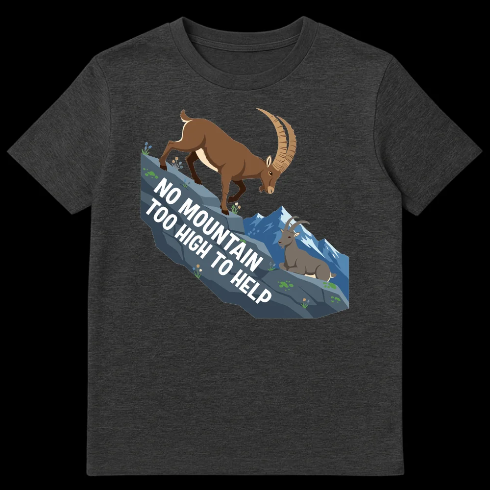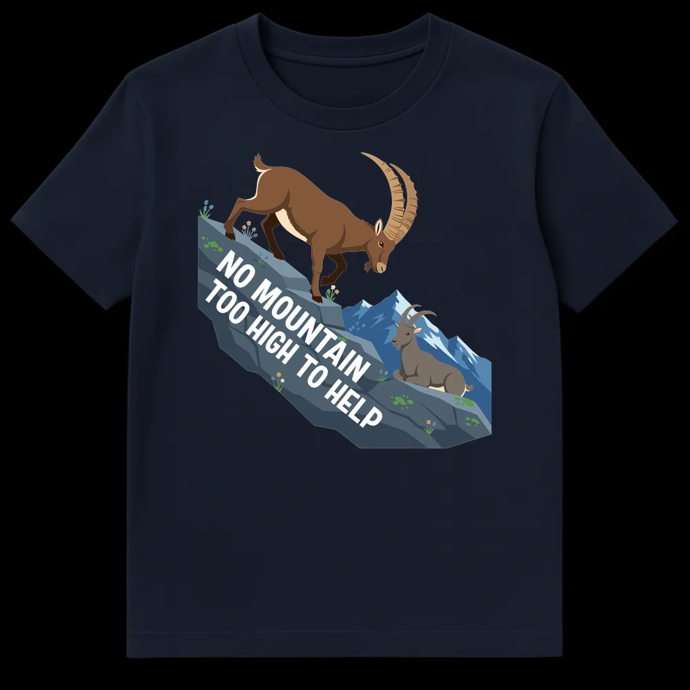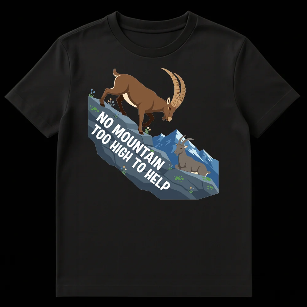 Embrace the spirit of altruism with our “NO MOUNTAIN TOO HIGH TO HELP” t-shirt, featuring two majestic Alpine Ibex. This clever design plays on words, twisting a classic idiom to promote a heartwarming message of support and kindness, subtly hinting that those who help are the ‘GOAT’. It’s a perfect gift for nature lovers, hikers, volunteers, or anyone who embodies a helpful, supportive attitude.