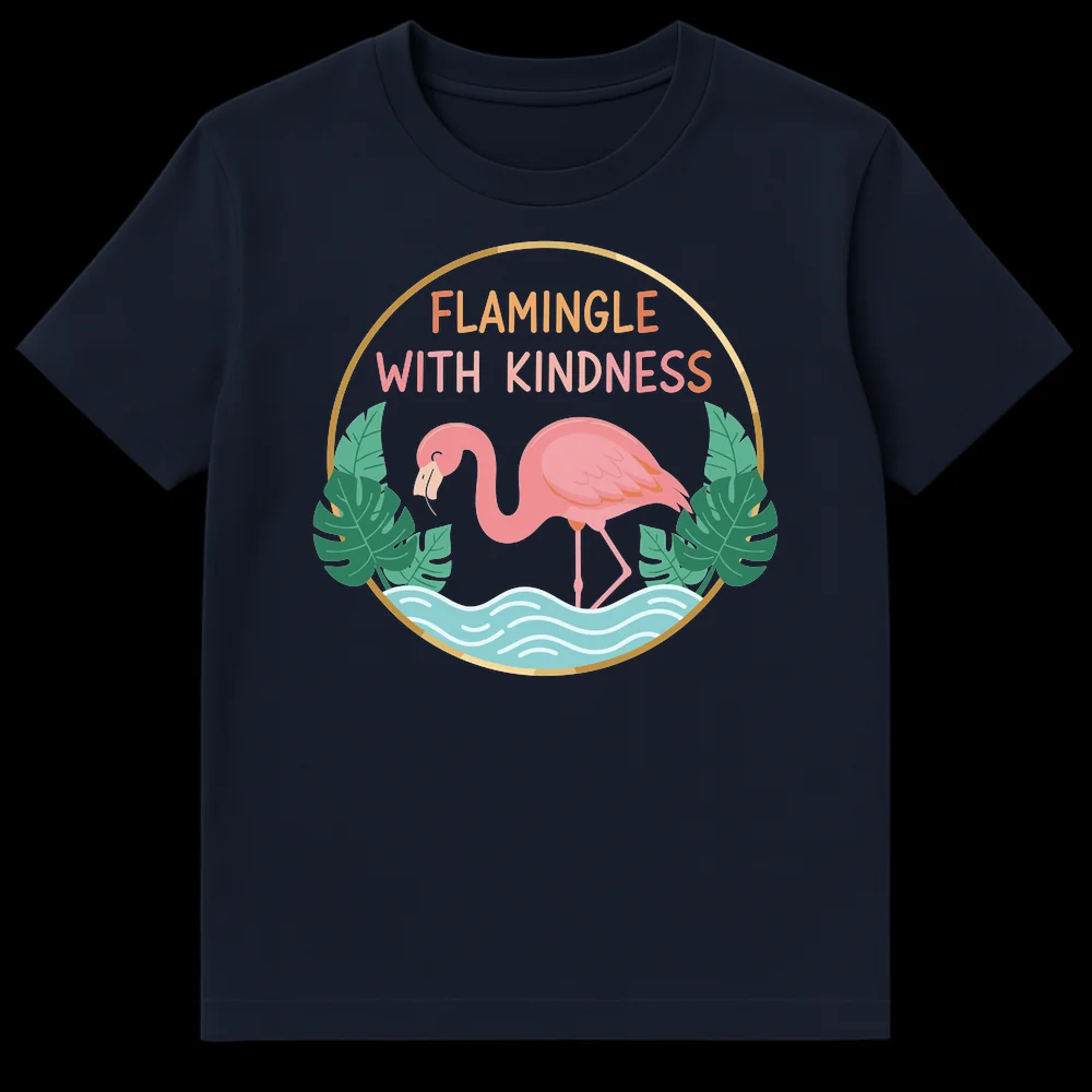 Embrace positivity with our ‘FLAMINGLE WITH KINDNESS’ t-shirt, featuring a charming pink flamingo in a vibrant tropical setting. This design uses a clever pun, blending “flamingo” and “mingle” to deliver a heartwarming message of kindness and social harmony. It’s a perfect gift for anyone who loves cute animal designs, appreciates puns, or wants to spread good vibes.