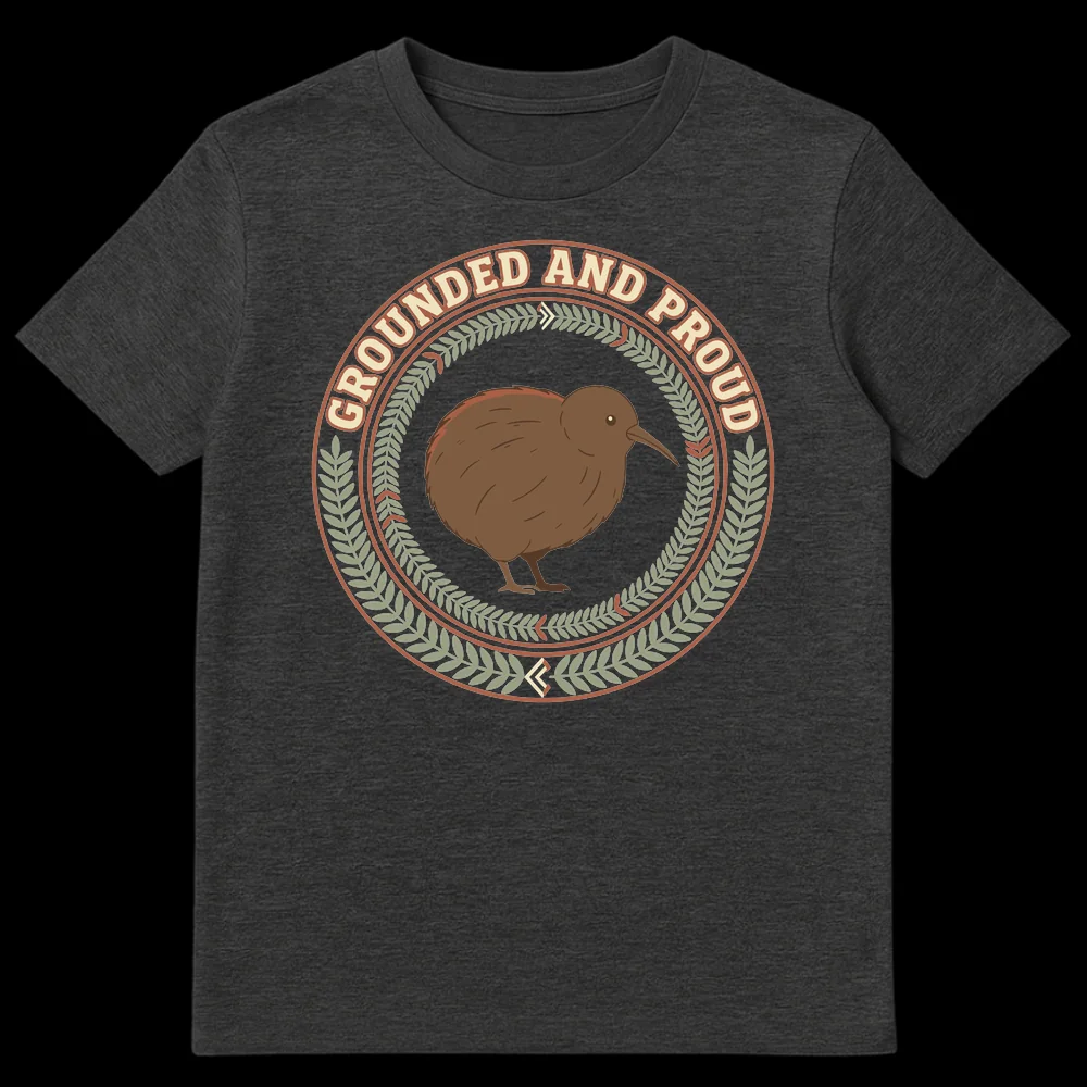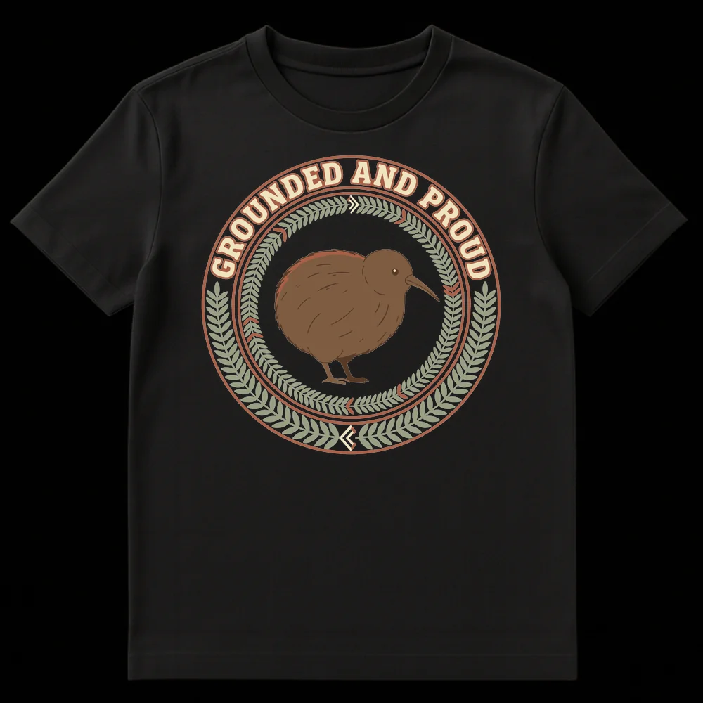 Embrace the clever charm of our “Grounded and Proud” Kiwi bird t-shirt! This design playfully puns on the flightless nature of the New Zealand icon, combining it with the positive trait of being down-to-earth. Featuring a stylized kiwi bird within a rustic emblem and botanical wreath, it’s a perfect gift for nature lovers, proud New Zealanders, or anyone who appreciates wholesome humor.