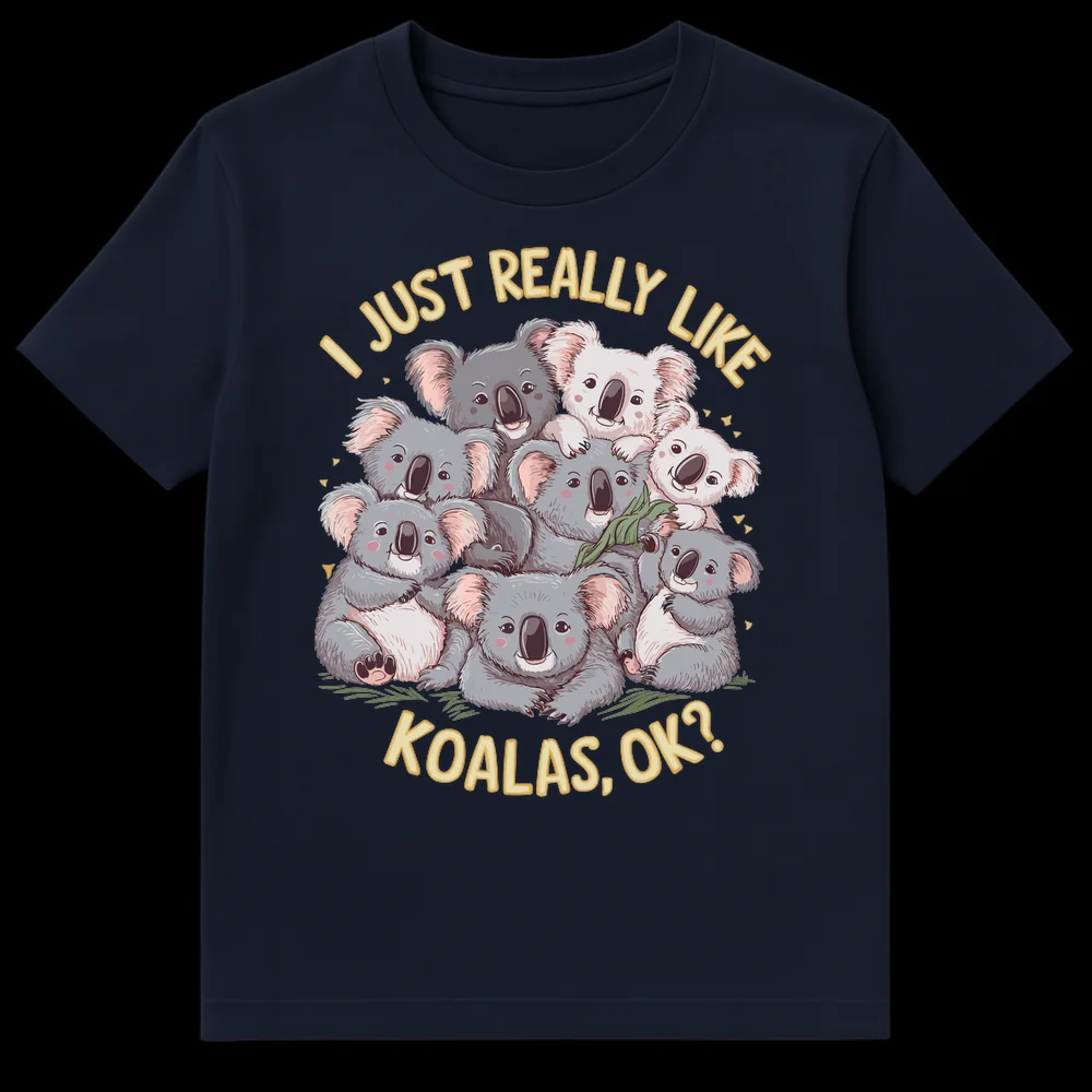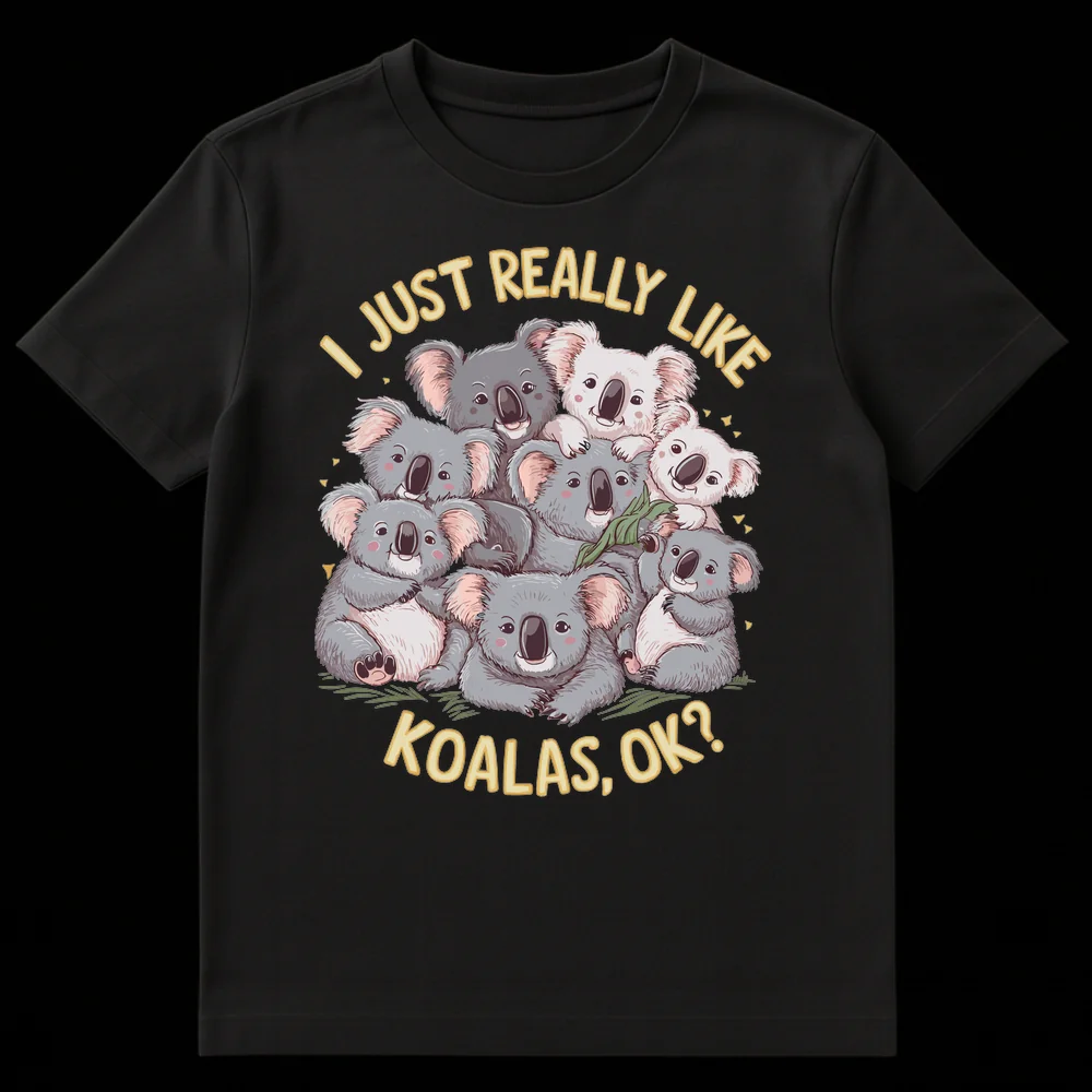 Embrace your soft side with our endearing Koala Lovers T-Shirt, a perfect declaration of your passion for these adorable marsupials. This charming design showcases a delightful pile of eight cuddly cartoon koalas, some hugging, some resting, all radiating irresistible cuteness, with one even holding a sprig of eucalyptus. The playful, bold text “I JUST REALLY LIKE KOALAS, OK?” adds a touch of lighthearted self-awareness, acknowledging a love so profound it needs no further explanation. It’s not just a shirt; it’s a wearable hug for koala enthusiasts of all ages. Crafted for comfort and style, this tee makes an unforgettable gift for animal lovers, nature enthusiasts, or anyone who cherishes the gentle charm of Australian wildlife. Perfect for casual outings, zoo visits, or simply expressing your love for koalas with a smile.
