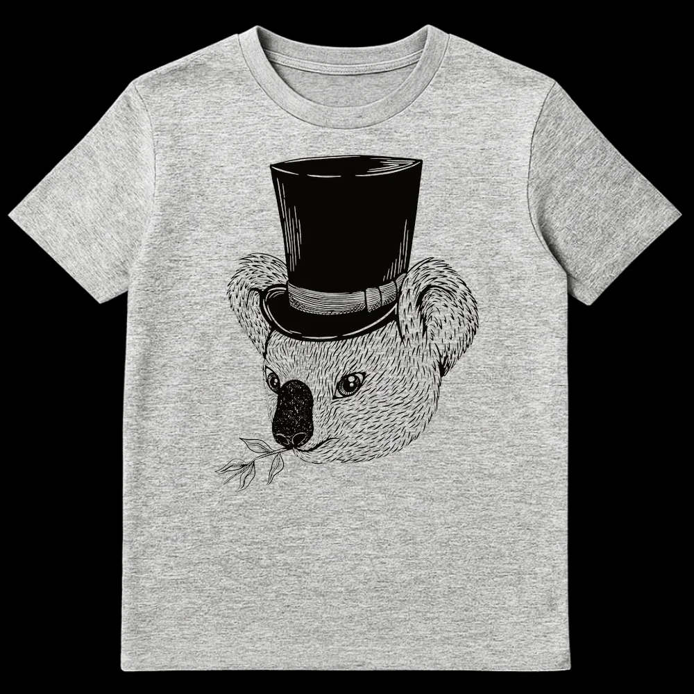 Embrace whimsical charm with our Dapper Koala T-Shirt, featuring a highly detailed, hand-drawn koala wearing a sophisticated top hat and holding a eucalyptus sprig. This unique black and white illustration blends natural Australian wildlife with a touch of refined eccentricity. It’s the perfect gift for koala enthusiasts, animal lovers, or anyone who appreciates sophisticated, artistic apparel with a subtle sense of humor.