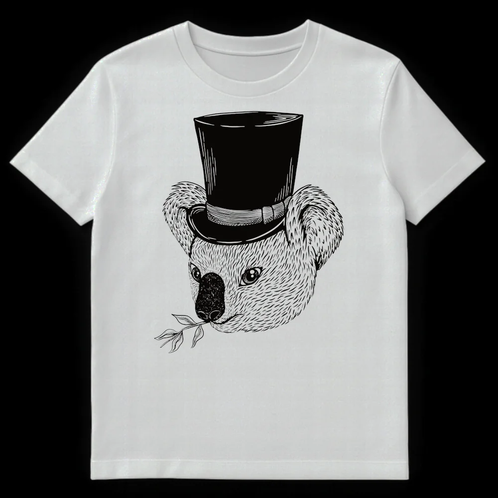 Discover a blend of elegance and whimsy with our Dapper Koala T-Shirt. This distinctive design showcases a magnificently detailed, hand-drawn koala, artfully rendered in a classic black and white style reminiscent of vintage engravings. Our charming marsupial dons a distinguished top hat, complete with a subtle band texture, and gently holds a sprig of eucalyptus leaves in its mouth, grounding its fanciful attire in its natural habitat. The sophisticated use of parallel and cross-hatching creates incredible depth and texture, particularly in the koala’s fur, making it a true work of art. This tee appeals to those who cherish unique animal art, Australian wildlife, and a refined, slightly quirky aesthetic. It’s an ideal choice for fashion-conscious individuals seeking a statement piece that stands out without being overtly flashy. Delight a koala enthusiast, an art lover, or anyone with a dry sense of humor. This shirt is more than just clothing; it’s a celebration of charming eccentricity and artistic detail, perfect for gifting or adding a touch of unique sophistication to your own wardrobe.