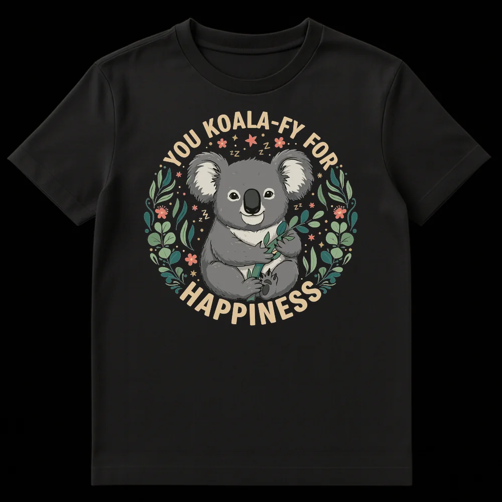 Celebrate joy with our adorable ‘YOU KOALA-FY FOR HAPPINESS’ t-shirt! This charming design features a cute, sleepy koala surrounded by a whimsical eucalyptus wreath, reminding everyone they deserve happiness. The clever ‘KOALA-FY’ pun makes it a unique, smile-inducing piece. Perfect for animal lovers, pun enthusiasts, or anyone needing an uplifting message.