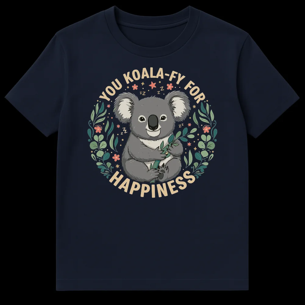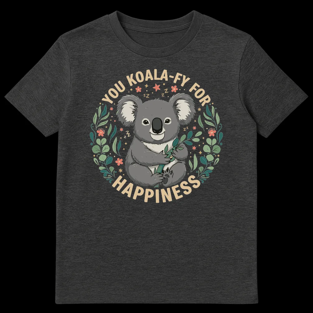 Embrace pure joy with our ‘YOU KOALA-FY FOR HAPPINESS’ t-shirt, a delightful blend of whimsy and warmth! This design showcases an irresistibly cute, smiling koala cradling eucalyptus, nestled within a beautiful wreath of leaves and tiny flowers. The clever ‘KOALA-FY’ wordplay transforms the phrase “you qualify for happiness” into a charming, koala-themed pun that brings an instant smile. Ideal for koala enthusiasts, animal lovers, or anyone who appreciates lighthearted humor and positive affirmations. Gift this wholesome encouragement to friends, family, or treat yourself to a daily reminder that you are worthy of joy. It’s a feel-good shirt designed to uplift spirits and spread happiness wherever you go.