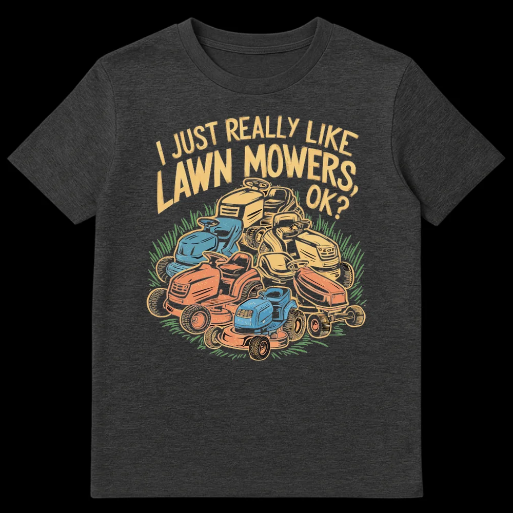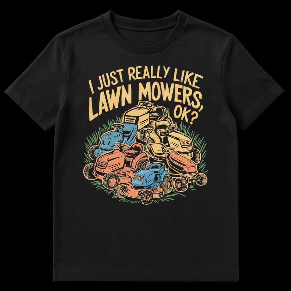 Declare your passion with our ‘I JUST REALLY LIKE LAWN MOWERS, OK?’ t-shirt. Featuring a whimsical pile of vintage-style mowers, this design celebrates a genuine love for yard work with a touch of deadpan humor. It’s the perfect gift for any lawn care enthusiast, proud homeowner, or anyone who finds joy in the hum of an engine and a perfectly cut lawn.