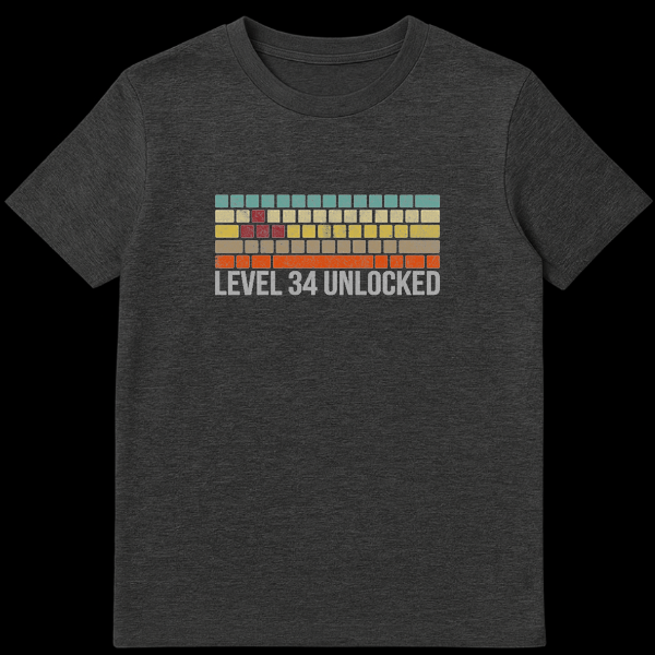 Get ready to press start on your thirty-fourth year with our Level 34 Unlocked T-Shirt. This design perfectly captures the golden age of arcades, featuring rows of vintage-colored bricks in teal, beige, yellow, and orange that recall classic brick-breaking and puzzle games. The distressed, pixelated grey font adds an authentic, worn-in arcade cabinet feel that any true gamer will appreciate. Whether you are an old-school console fan or just love the retro aesthetic, this shirt is a fun way to announce your age without just saying a number. It is the ultimate birthday gift for the 34-year-old gamer in your life, offering a unique blend of nostalgia and celebration. Level up your wardrobe today!