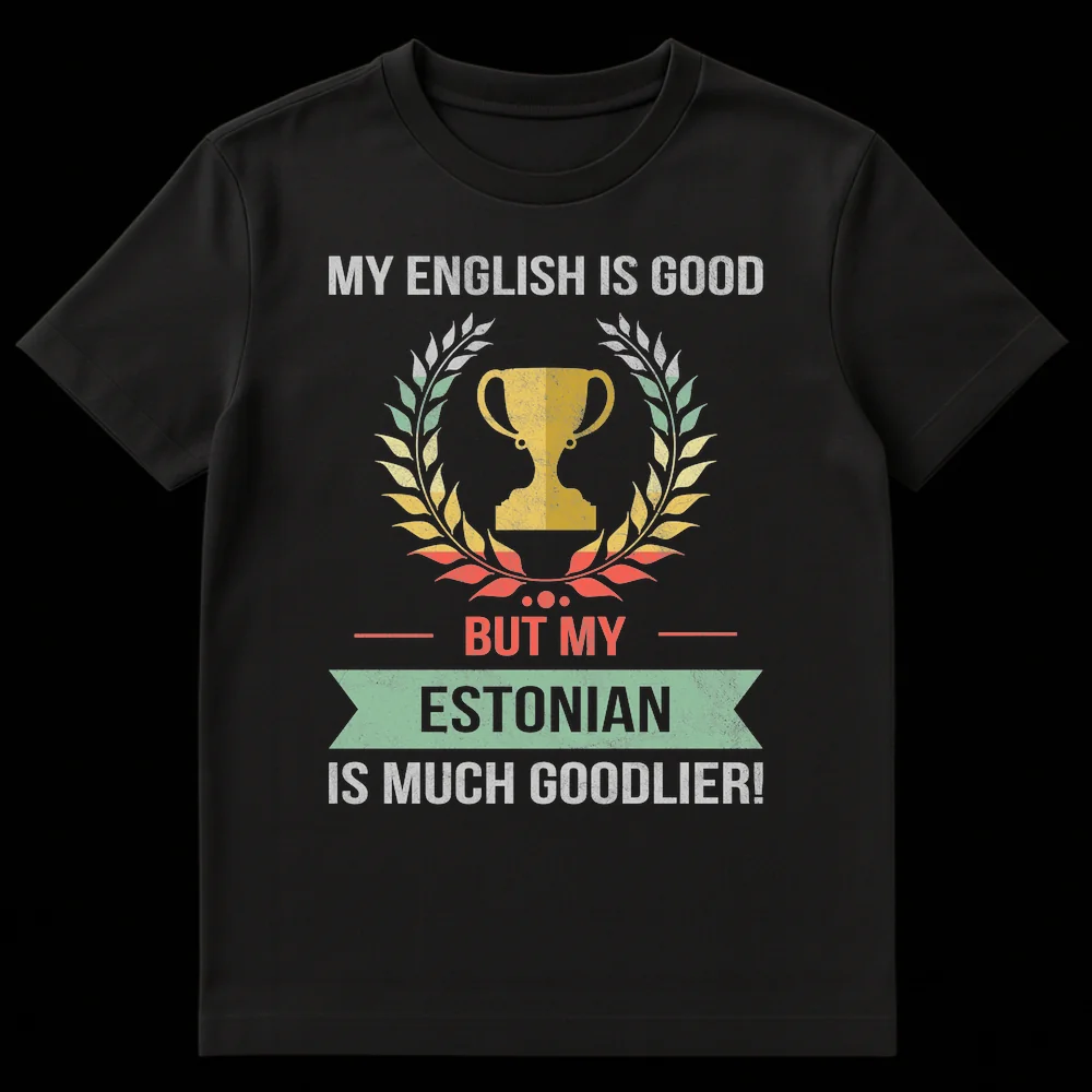 Embrace your roots and sense of humor with our unique “MY ENGLISH IS GOOD BUT MY ESTONIAN IS MUCH GOODLIER!” t-shirt. This design playfully boasts linguistic pride, using a charmingly incorrect English comparative to highlight a superior command of Estonian. Adorned with a vintage distressed trophy and laurel wreath graphic, it symbolizes your linguistic ‘victory’ in a lighthearted, witty manner. The muted, retro color palette on a classic black background gives it a timeless, established feel. Perfect for Estonian natives, those learning the language, or anyone proud of their heritage, this tee is more than just clothing—it’s a statement. It makes a fantastic personal purchase or a thoughtful gift for friends and family who appreciate clever wordplay and celebrate their Estonian connection.