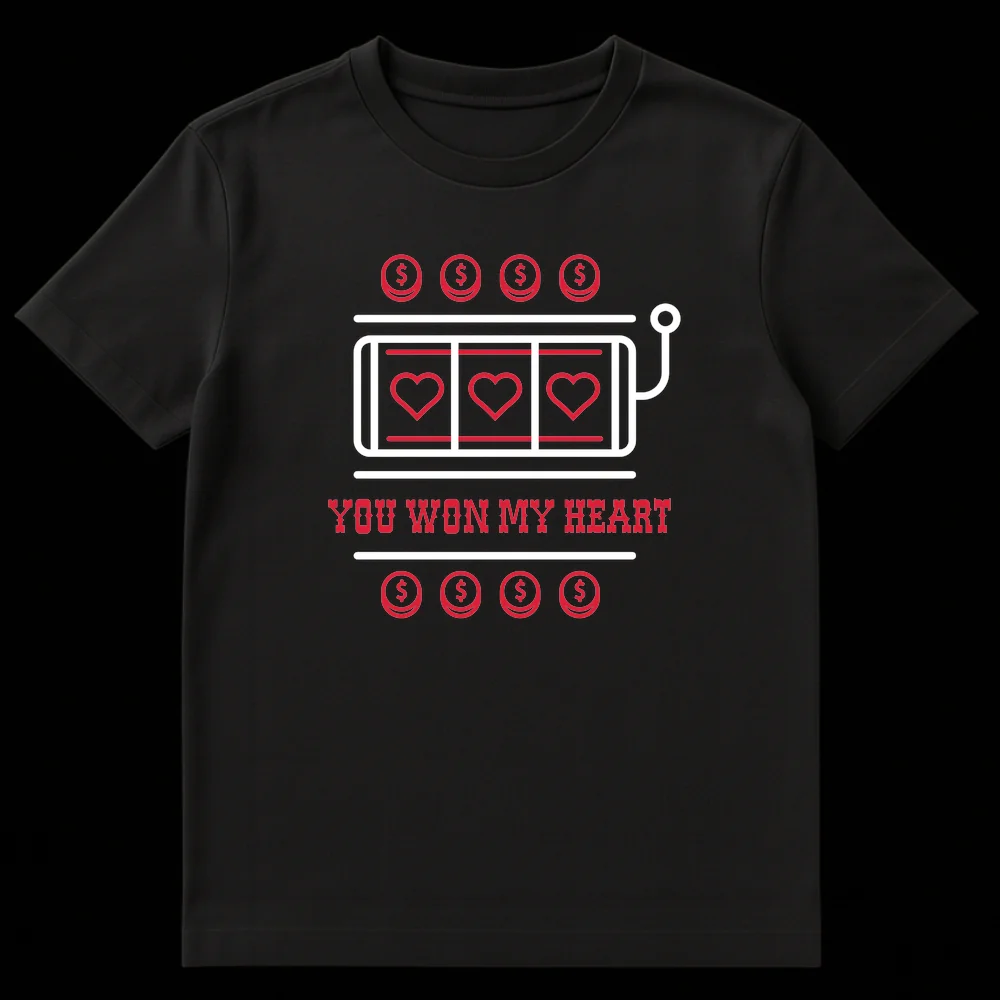 Declare your affection with our unique “You Won My Heart” t-shirt, a playful blend of romance and casino charm. This minimalist design showcases a stylish slot machine, where traditional symbols are replaced by three vibrant red hearts, signifying a romantic jackpot. The bold text “YOU WON MY HEART” perfectly complements the visual pun, making it a sweet and clever statement piece. Crafted for those who appreciate a good laugh and heartfelt gesture, this tee speaks volumes without being overly sentimental. It’s an excellent choice for couples, a thoughtful anniversary present, a witty Valentine’s Day gift, or a fun way to express your love to a special boyfriend, girlfriend, husband, or wife. Surprise your partner with this endearing design that celebrates your unique connection and the joyous feeling of having truly won their heart.