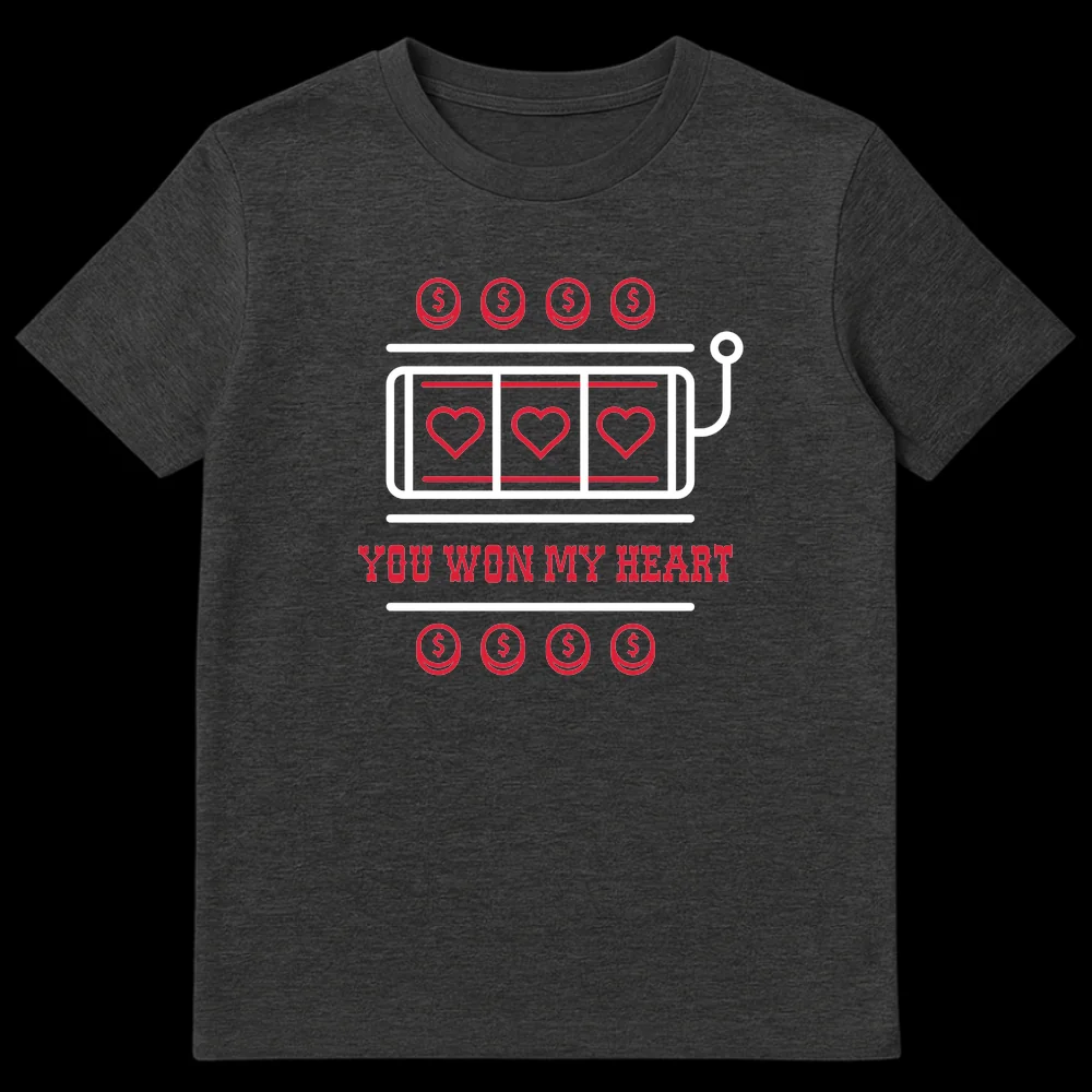 Celebrate your love with this clever “You Won My Heart” t-shirt, featuring a minimalist slot machine graphic hitting the jackpot with three vibrant red hearts. This design playfully merges the thrill of winning with the joy of finding love, creating a unique romantic pun. It’s an ideal gift for your boyfriend, girlfriend, husband, or wife, perfect for anniversaries, Valentine’s Day, or just to show appreciation.