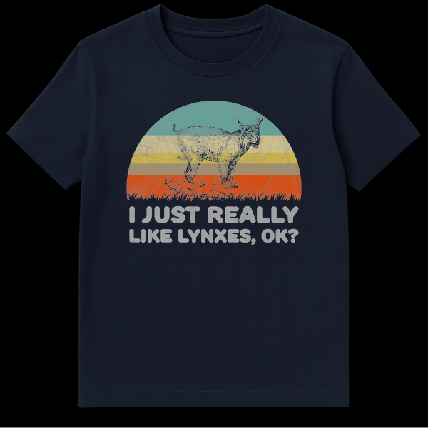 Showcase your adoration for the elusive lynx with this unique ‘I JUST REALLY LIKE LYNXES, OK?’ t-shirt. This design captures a beautiful lynx, rendered with intricate detail, standing prominently against a vintage-inspired arched background. The background features horizontal, distressed stripes in a classic retro palette of faded teal, muted yellow, dull tan, and burnt orange, giving it a cool, worn aesthetic. Below the majestic creature, the distressed capital letters boldly state your simple, heartfelt truth. This shirt isn’t just clothing; it’s a playful yet profound statement for anyone who finds themselves captivated by these fascinating big cats. It makes an ideal gift for wildlife enthusiasts, animal lovers, or anyone who appreciates a touch of retro charm and a good-humored declaration of their unique interests. Perfect for casual outings, nature walks, or just lounging at home, this tee lets you wear your lynx love with pride and a smile.