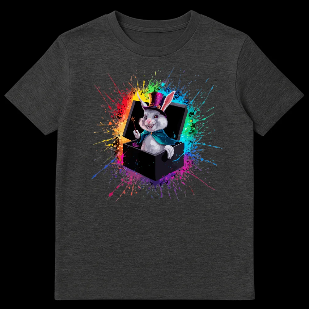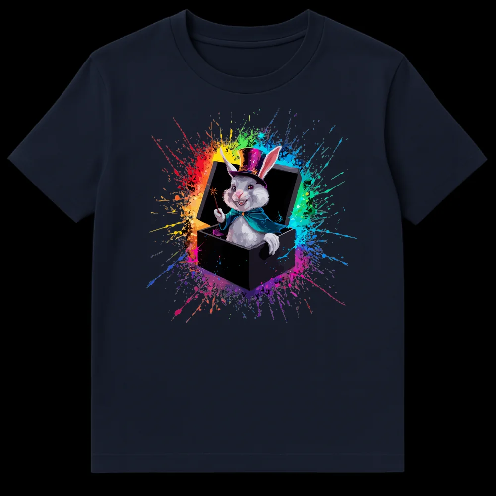 Unleash a burst of wonder with this vibrant Magician Rabbit t-shirt, celebrating the classic “rabbit out of a hat” trick. Featuring a charming rabbit in a top hat and cape, wielding a magic wand amidst an explosion of rainbow paint splatters, this design captures pure, whimsical magic. It’s an ideal gift for magic enthusiasts, animal lovers, or anyone who adores playful, colorful art.
