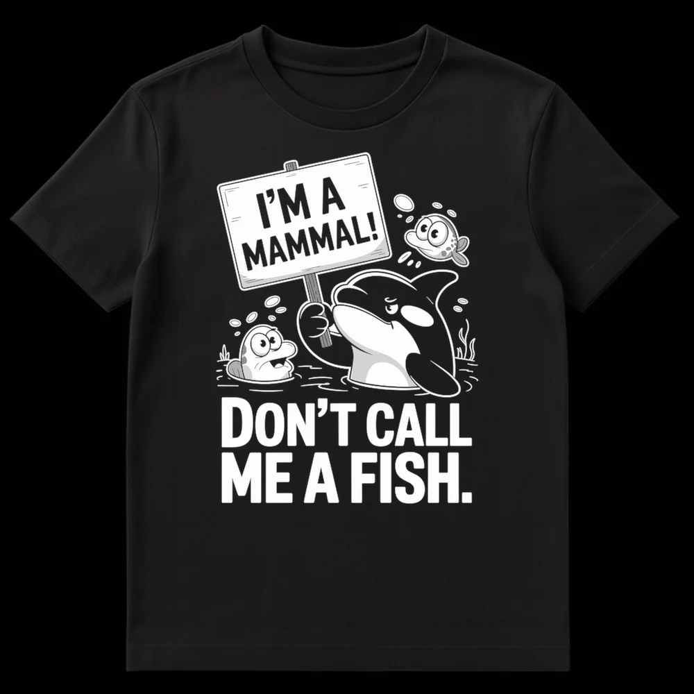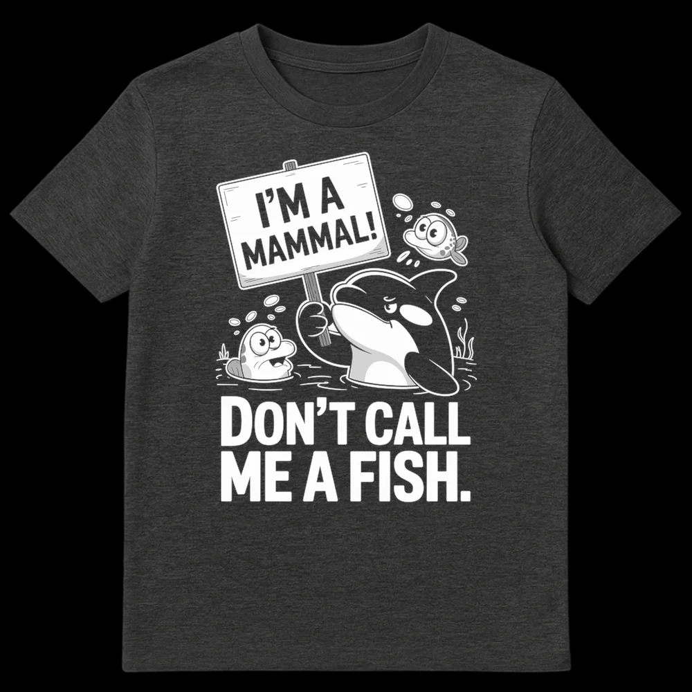 Make a splash with our “I’M A MAMMAL! DON’T CALL ME A FISH.” t-shirt, featuring a witty orca on a mission to educate! This charming design humorously corrects a common misconception, making it a perfect conversation starter. Ideal for animal lovers, science enthusiasts, or anyone who appreciates a clever marine biology joke.
