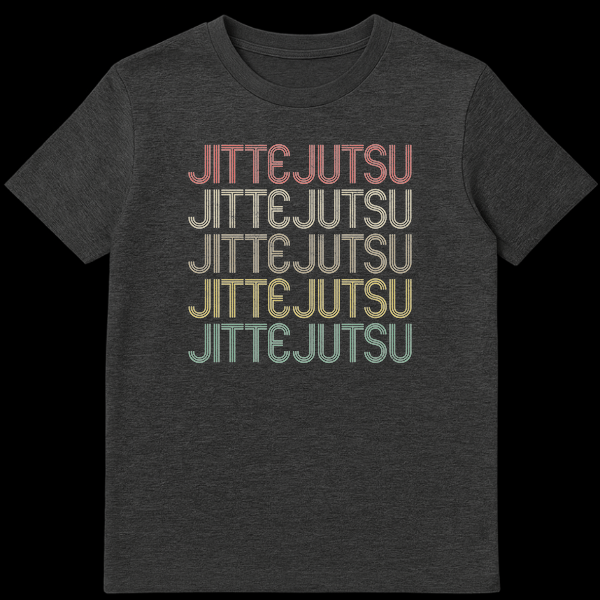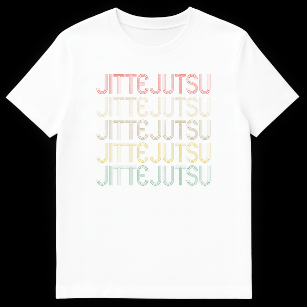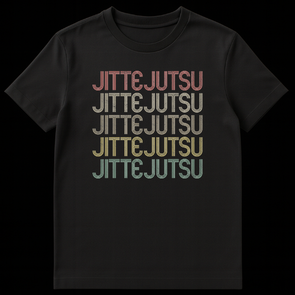 Unleash your inner martial arts connoisseur with this vintage-inspired “Jittejutsu” t-shirt. Featuring a clever phonetic play on “Jiu-Jitsu” with the classic Japanese weapon Jitte, this design is sure to spark smiles among fellow practitioners. Its retro striped typography and distressed gradient colors on a black background create a unique, old-school vibe. A perfect gift for BJJ enthusiasts, traditional martial artists, or anyone who appreciates niche humor and retro fashion.
