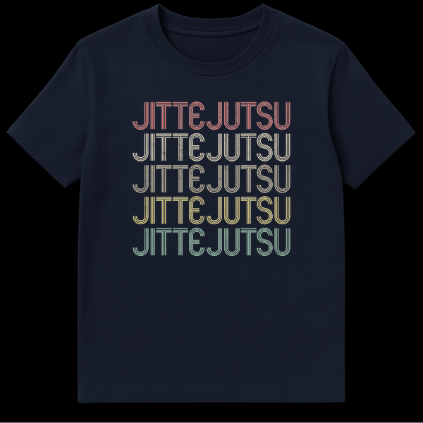Step onto the mats or into your daily routine with our exclusive “Jittejutsu” t-shirt, a true conversation starter for any martial arts enthusiast. This unique design features the word “JITTEJUTSU” repeated five times in a stacked, multi-lined retro font, paying homage to the traditional Japanese martial art of the jitte weapon. The humor lies in a clever phonetic pun, playfully substituting “Jiu” with “Jitte”—a subtle nod that only true martial artists and BJJ fans will appreciate. Each line boasts a distressed texture with a retro-inspired gradient of muted coral, beige, mustard, yellow, and dusty teal against a stark black background, giving it an authentic vintage feel. This shirt isn’t just clothing; it’s a statement of insider knowledge and cool, understated style. It makes an ideal gift for practitioners of Brazilian Jiu-Jitsu, Judo, Karate, Kendo, or anyone deeply immersed in Japanese martial arts culture and the art of subtle wordplay. Wear your passion with pride and a touch of retro cool!
